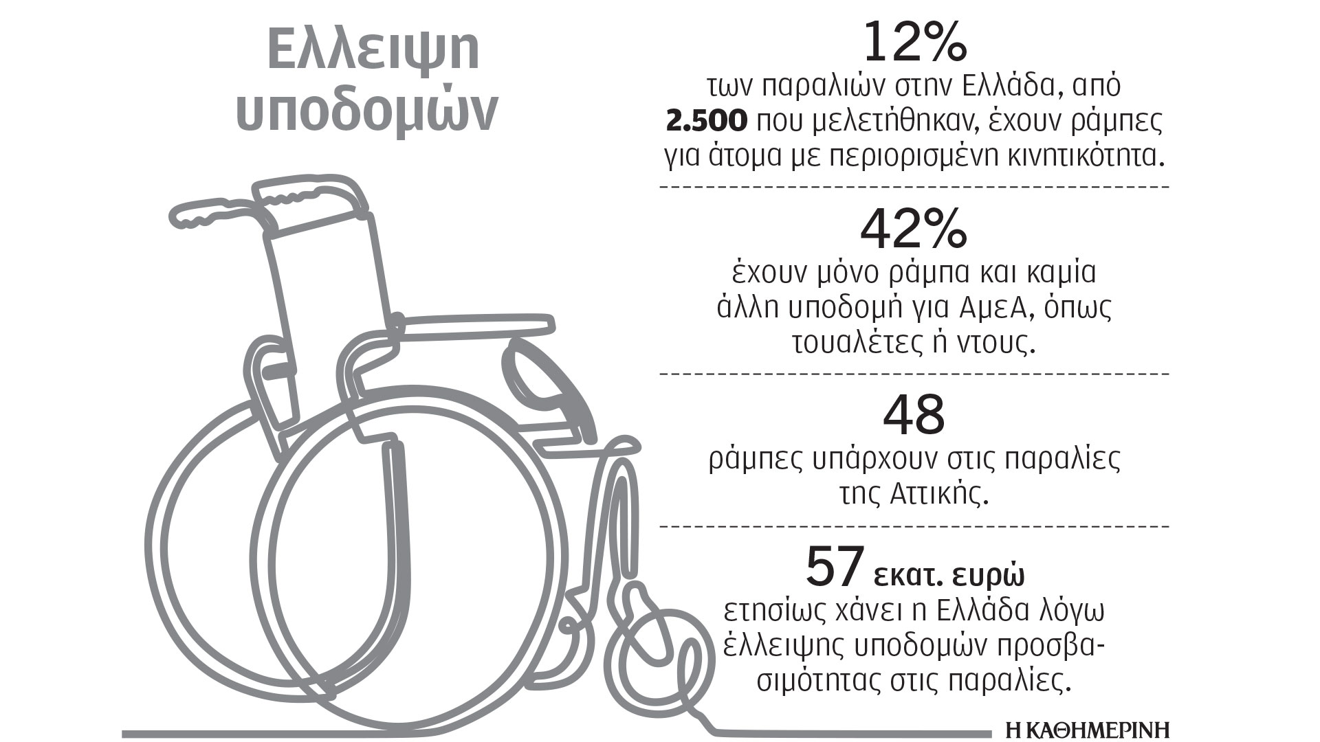 Υπολογίζεται ότι στη χώρα μας υπάρχουν περίπου 108.000 άνθρωποι που χρησιμοποιούν αναπηρικό αμαξίδιο. Για τους ανθρώπους αυτούς ο πιο απλός και διαδεδομένος τρόπος διασκέδασης στη χώρα μας το καλοκαίρι, η επίσκεψη σε μια παραλία, παραμένει δύσκολη υπόθεση καθώς οι υποδομές είναι ακόμα πολύ περιορισμένες.