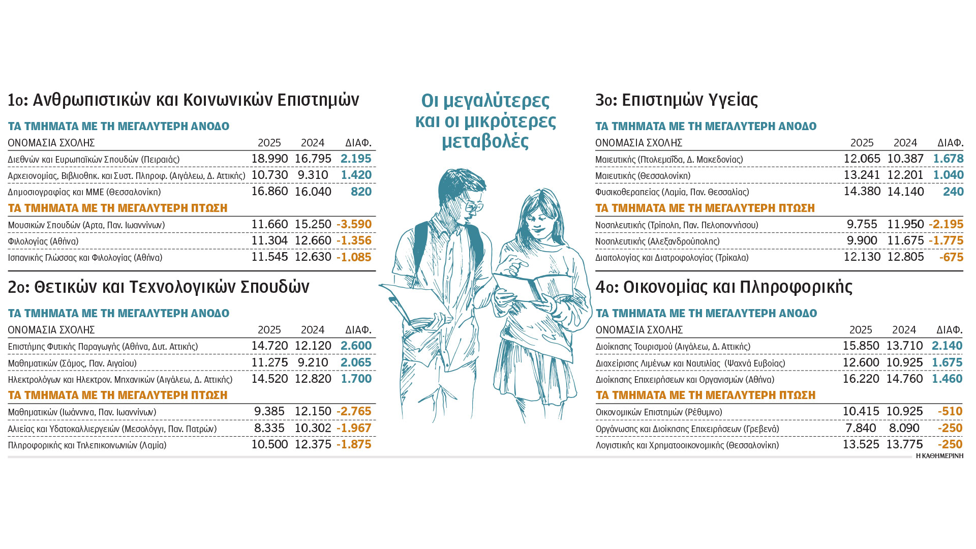 Ιατρική Αθηνών 18.775 μονάδες (0 μονάδες), Ιατρική ΑΠΘ 18.575 (+25), Ιατρική Θράκης 17.975 (0), Η/Υ ΕΜΠ 18.390 (-100), Η/Υ ΑΠΘ 17.960 (+40), Ναυπηγών ΕΜΠ 17.840 (+80), Νομική Αθηνών 17.875 (-150), Νομική ΑΠΘ 17.280 (-60), Πληροφορικής και Τηλεπικοινωνιών ΕΚΠΑ 16.955 (+120), Διοικητικής Επιστήμης και Τεχνολογίας ΟΠΑ 18.400 (+225), Μάρκετινγκ και Επικοινωνίας ΟΠΑ 16.350 (+375), Ψυχολογίας ΕΚΠΑ 17.475 (-120) και Ψυχολογίας ΑΠΘ 17.150 μονάδες (-190).