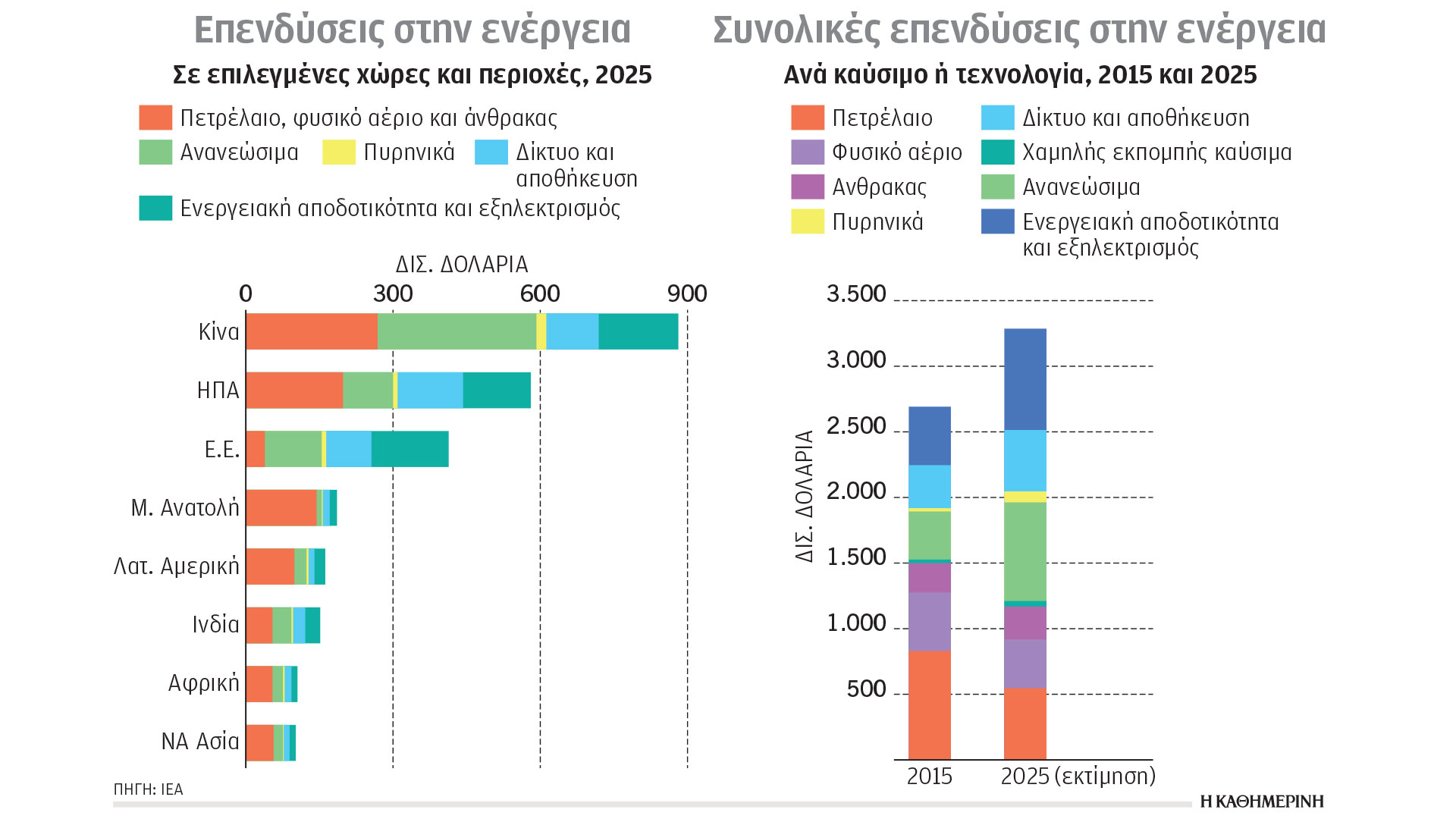 Το 2025, οι παγκόσμιες επενδύσεις στην ενέργεια αναμένεται να αγγίξουν τα 3,3 τρισ. δολάρια (αύξηση 22% έναντι του 2015), με την Κίνα να επενδύει συνολικά στην ενέργεια σχεδόν όσα επενδύουν ΗΠΑ και Ε.Ε. μαζί. Από το σύνολο των 3,3 τρισ. δολαρίων, θα διατεθούν σε καθαρές μορφές ενέργειας τα 2,2 τρισ. δολάρια, δηλαδή διπλάσια από αυτά που θα επενδυθούν σε ορυκτά καύσιμα, όταν το 2015, από τα συνολικά 2,7 τρισ. δολάρια ενεργειακών επενδύσεων, μόλις το 1,2 τρισ. δολάρια αφορούσαν καθαρές μορφές ενέργειας. Σήμερα, παρά τις μεγάλες επενδύσεις σε ανανεώσιμα, τα δίκτυα ηλεκτρικής ενέργειας υστερούν (440 δισ. δολάρια/έτος) και απαιτείται άμεση αύξηση των επενδύσεών τους για ομαλή ενεργειακή μετάβαση.