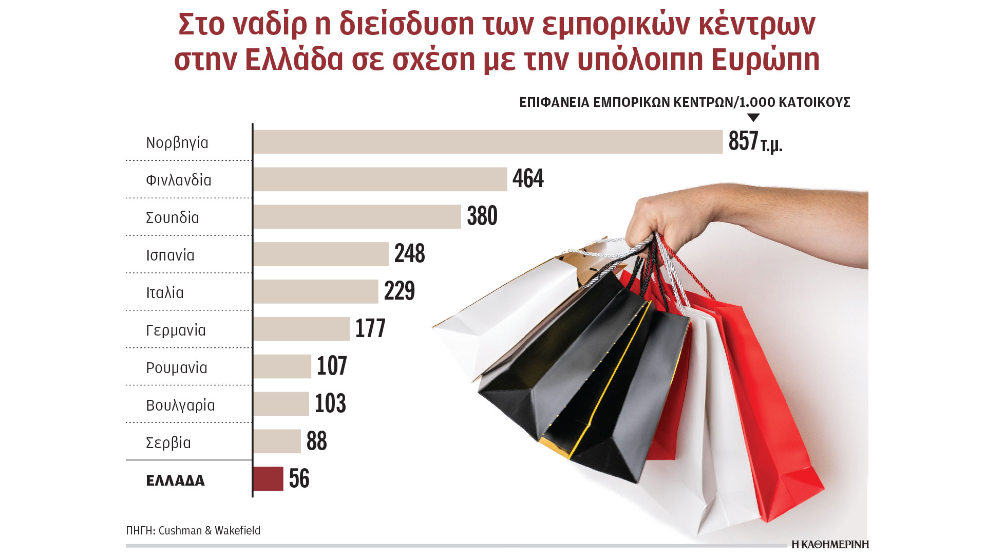 Στη χώρα μας αναλογούν 56 τ.μ. εμπορικών κέντρων ανά 1.000 κατοίκους έναντι 88 τ.μ. στη Σερβία και 103 τ.μ. στη Βουλγαρία.