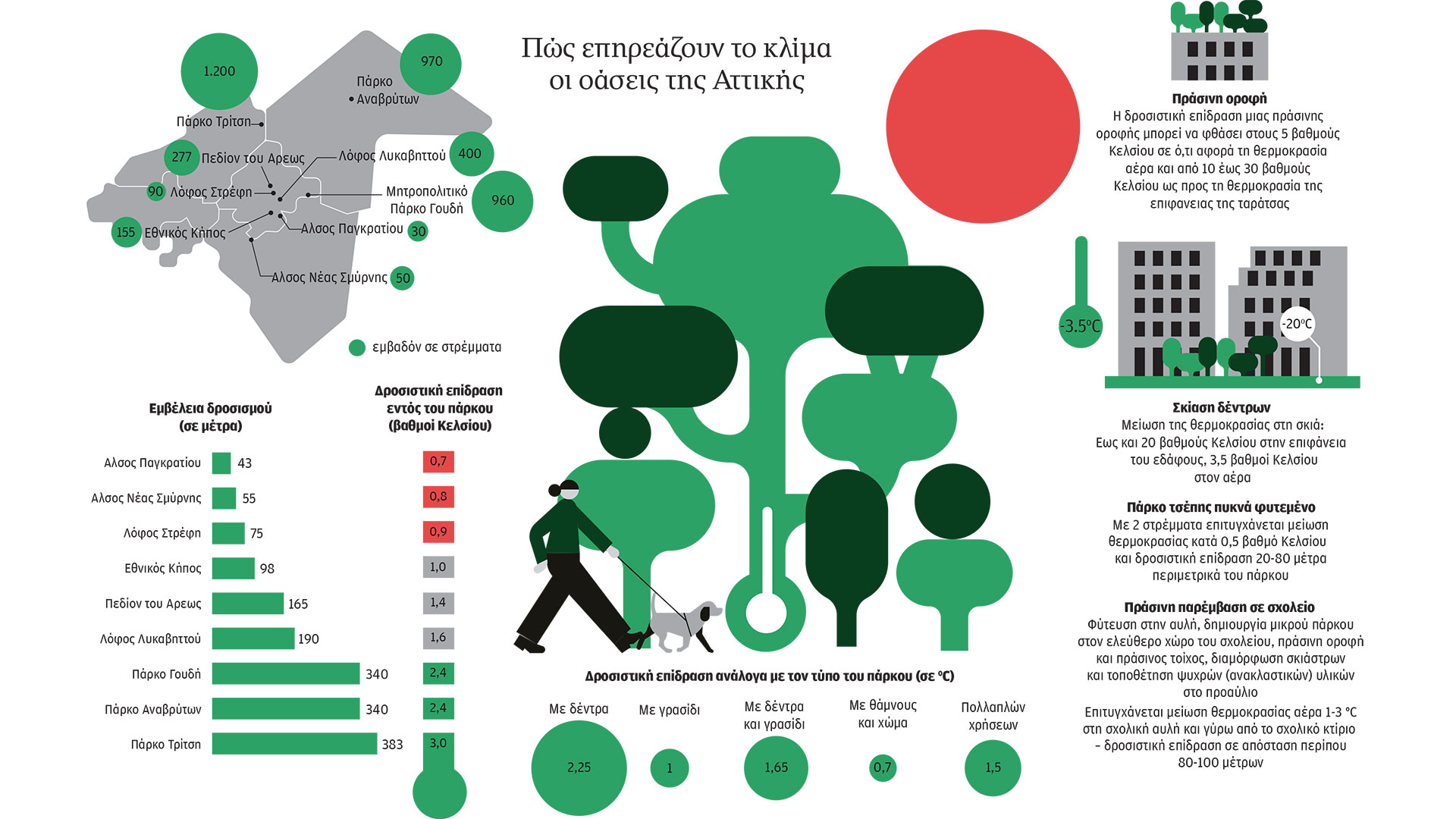 Στην Αθήνα, η μελετητική ομάδα του ΕΚΠΑ κατέγραψε τη μείωση της ζέστης στην επικράτεια ορισμένων από τους πιο σημαντικούς χώρους πρασίνου, καθώς και την εμβέλεια του δροσιστικού του αγγίγματος. Από τους 0,7 °C και τα 43 μέτρα του Αλσους Παγκρατίου των 30 στρεμμάτων, τον 1 °C του Εθνικού Κήπου των 155 στρεμμάτων με 98 μέτρα επίδρασης, τον 1,4 °C και τα 165 μέτρα ακτίνα δροσιστικής επίδρασης του Πεδίου του Αρεως (277 στρ.), μέχρι τους 2,4 °C και τα 340 μέτρα επίδρασης του Μητροπολιτικού Πάρκου Γουδή (960 στρ.) και του Πάρκου των Αναβρύτων (970 στρ.). Στην κορυφή των πράσινων χώρων της πρωτεύουσας, το Πάρκο Τρίτση των 1.200 στρεμμάτων που ρίχνει τη θερμοκρασία 3 °C και έχει ακτίνα δροσιάς 383 μέτρα.