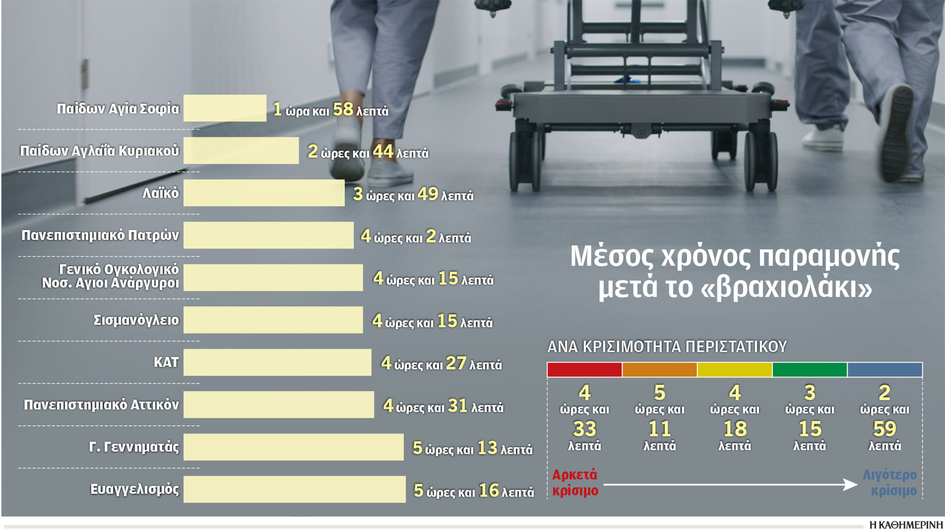 Στις εφημερίες των νοσοκομείων αυτών, από τη στιγμή που συνδέθηκαν στο σύστημα, έχουν εξυπηρετηθεί 44.032 ασθενείς. Ο υψηλότερος χρόνος αναμονής καταγράφεται στον Ευαγγελισμό και είναι 5 ώρες και 16 λεπτά. Ακολουθούν το «Γεννηματάς» με 5 ώρες και 13 λεπτά, το Αττικόν με 4 ώρες και 31 λεπτά και το ΚΑΤ με 4 ώρες και 27 λεπτά. Χαμηλότερος μέσος χρόνος παραμονής στα επείγοντα παρατηρείται αυτή την περίοδο στο νοσοκομείο Παίδων «Αγία Σοφία» και είναι 2 ώρες. Ο χρόνος αναμονής για τα πιο σοβαρά περιστατικά, τα «κόκκινα», με βάση την αξιολόγηση των γιατρών είναι 4 ώρες και 33 λεπτά, για τα μέτρια περιστατικά 4 ώρες και 18 λεπτά και για τα πολύ ελαφριά σχεδόν 3 ώρες.