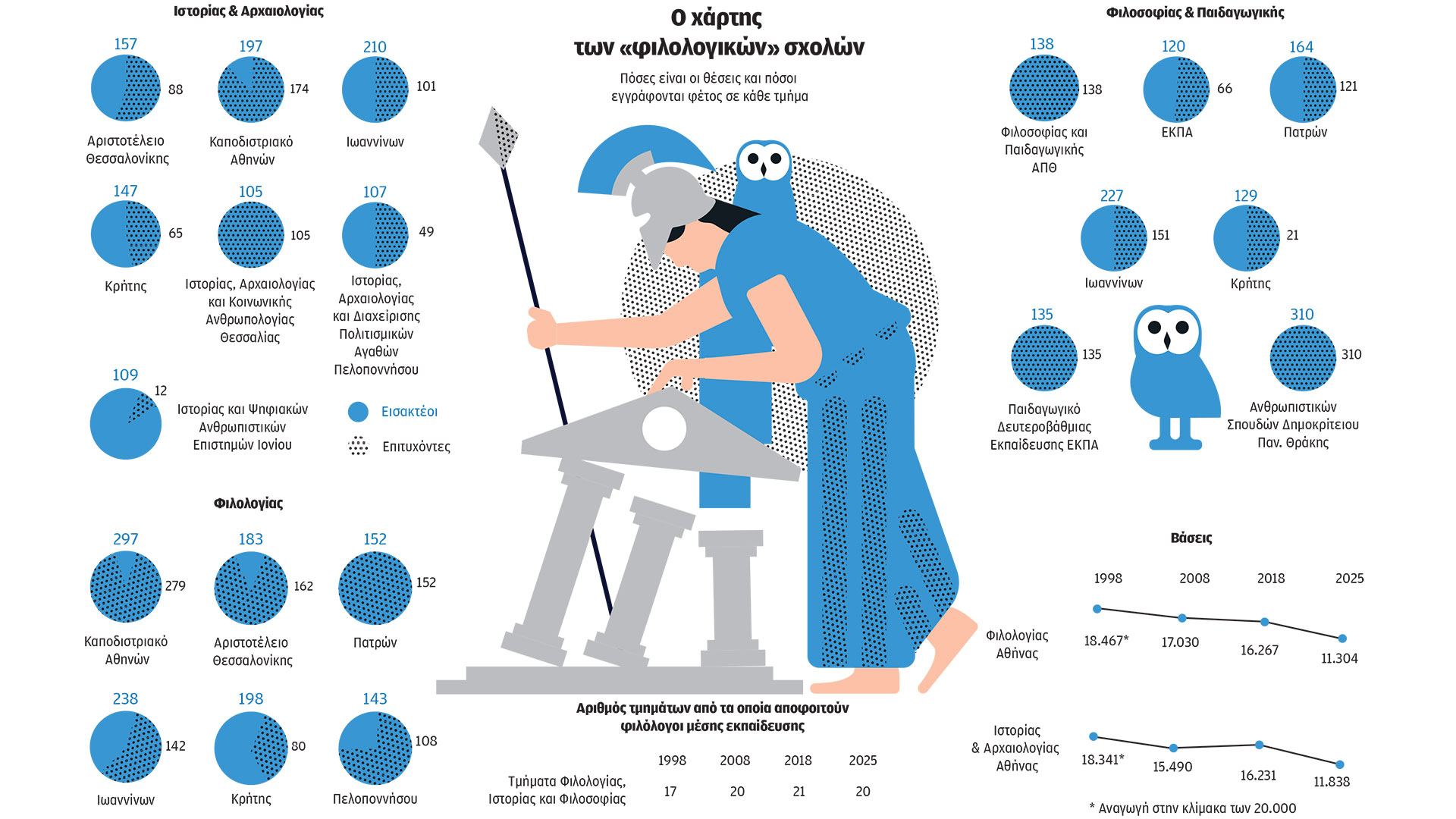 Οι αριθμοί μιλούν από μόνοι τους. Για να σπουδάσει κανείς φιλολογία, αρκεί να έχει γράψει στις Πανελλαδικές 8,5. Στα τμήματα φιλολογίας, ιστορίας – αρχαιολογίας και φιλοσοφίας με υψηλότερη βάση μπορεί να μπει με 12,5. Η υποβάθμιση των σχολών κλασικών σπουδών στην Ελλάδα θα μπορούσε να είναι μέρος της απαξίωσης των ανθρωπιστικών σπουδών που παρατηρείται παντού στον κόσμο. Τι σημαίνει, όμως, για τα ελληνικά πανεπιστήμια η υποχώρηση του ενδιαφέροντος γι’ αυτά τα τμήματα; Χρειαζόμαστε τόσους φιλολόγους και ιστορικούς; Πόσο καλά καταρτισμένοι θα είναι οι φιλόλογοι που θα κληθούν να διδάξουν γλώσσα και ιστορία στα γυμνάσια και τα λύκεια του μέλλοντος;