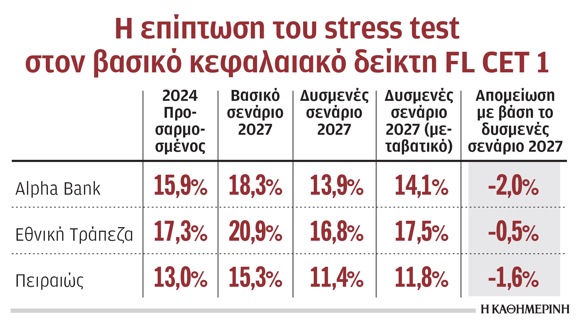 Για την Alpha Bank τα αποτελέσματα του stress test υπό το δυσμενές σενάριο ενσωματώνουν ένα συντηρητικό ποσοστό διανομής μερισμάτων 50% για τα έτη κατά τα οποία η τράπεζα εμφανίζει κέρδη. Οπως ανακοίνωσε η Alpha Bank, στο δυσμενές σενάριο η μείωση κεφαλαίου του δείκτη CET 1, με πλήρη εφαρμογή των μεταβατικών διατάξεων, σε χρονικό ορίζοντα τριετίας, ανέρχεται σε ποσοστό κάτω από 2% για την τράπεζα (σε σχέση με περίπου 3,1% ποσοστό μείωσης κεφαλαίου στην προηγούμενη άσκηση που έγινε το 2023) έναντι 3% του μέσου όρου της στην Ευρωπαϊκή Ενωση (ο μέσος όρος της EBA στο stress test του 2023 ήταν περίπου 4,6%).