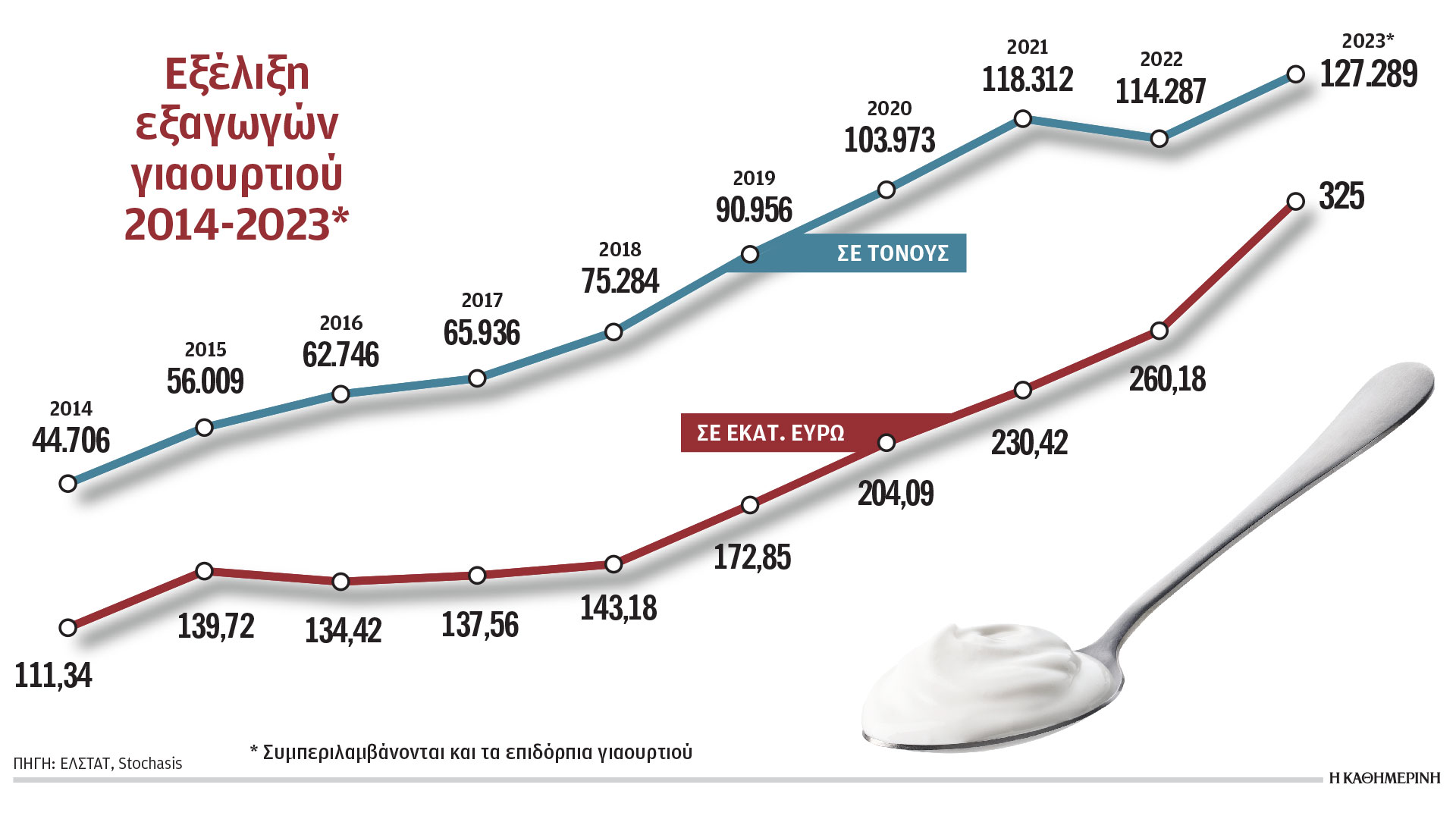 Αποτέλεσμα; Μέσα σε μία δεκαετία οι ελληνικές εξαγωγές γιαουρτιού έχουν σχεδόν τριπλασιαστεί τόσο σε όγκο όσο και σε αξία. Ετσι, ενώ το 2014 οι εξαγωγές γιαουρτιού ήταν 44.706 τόνοι, το 2023 ξεπέρασαν τις 127.000 τόνους, με την αξία των εξαγωγών να διαμορφώνεται σε 325 εκατ. ευρώ, από περίπου 111 εκατ. ευρώ το 2014.