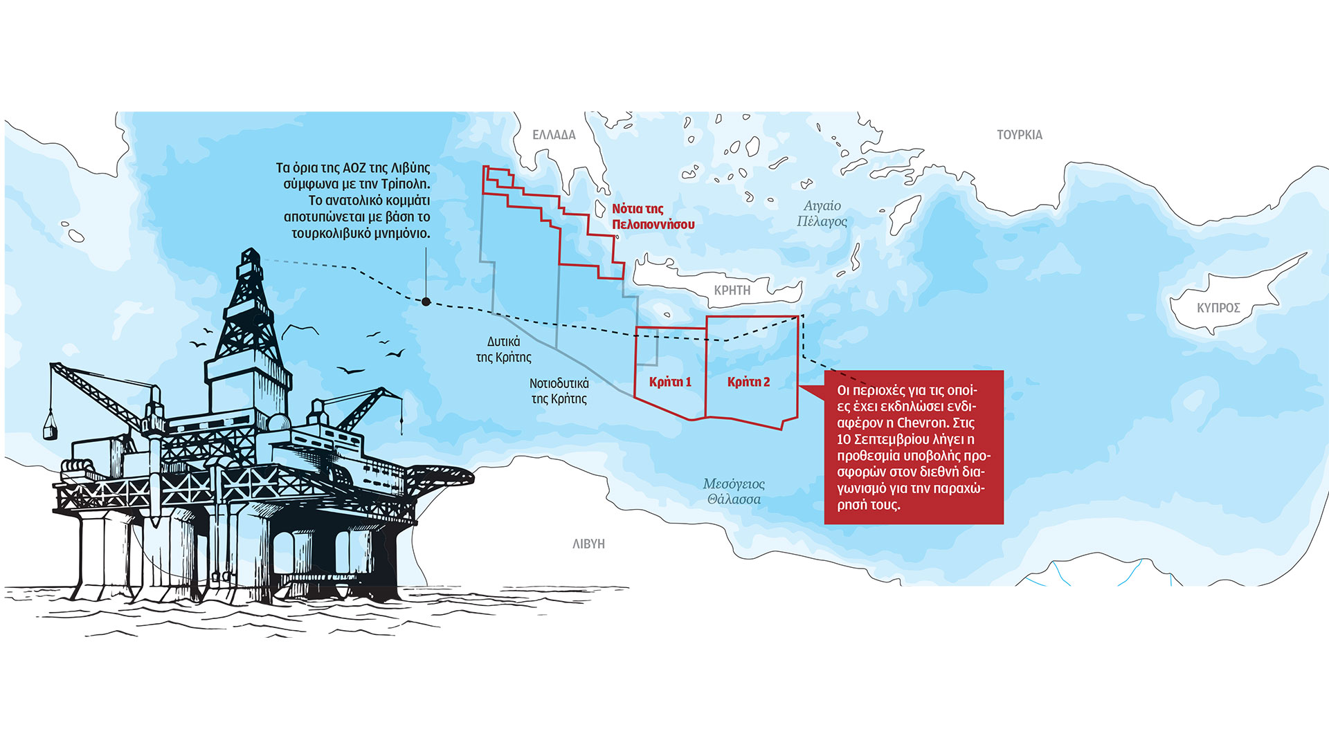 Ο δρόμος για την είσοδο της Ελλάδας στο «ενεργειακό κλαμπ» των χωρών της περιοχής, όπου συμμετέχουν το Ισραήλ, η Αίγυπτος, η Κύπρος, ο Λίβανος και εσχάτως –μετά 10 χρόνια απουσίας– η Λιβύη, άνοιξε με την παρουσία της αμερικανικής ExxonMobil στα θαλάσσια οικόπεδα δυτικά και νοτιοδυτικά της Κρήτης το 2019. Απέκτησε νέα δυναμική μετά την εκδήλωση του ενδιαφέροντος της δεύτερης μεγαλύτερης παγκοσμίως πετρελαϊκής και μεγαλύτερου ανταγωνιστή της ExxonMobil, της επίσης αμερικανικής Chevron, για δύο περιοχές της Κρήτης («Κρήτη Ι» και «Κρήτη ΙΙ») και μία νοτίως της Πελοποννήσου. Το σύνολο των πέντε εφαπτόμενων οικοπέδων (δύο της ExxonMobil που της έχουν παραχωρηθεί σε κοινοπραξία με τη Helleniq Energy και τα τρία νέα που διεκδικεί η Chevron) δημιουργούν ένα συνεχόμενο πεδίο για έρευνες υδρογονανθράκων μιας έκτασης που φτάνει τα 81.655 τετραγωνικά χιλιόμετρα –35.655 τ. χλμ. στα οποία έχει αναπτύξει ερευνητική δραστηριότητα η ExxonMobil και 46.000 τ. χλμ. που έχουν προσελκύσει το κατ’ αρχήν ενδιαφέρον της Chevron–, αυξάνοντας σημαντικά τις πιθανότητες εντοπισμού κοιτασμάτων.