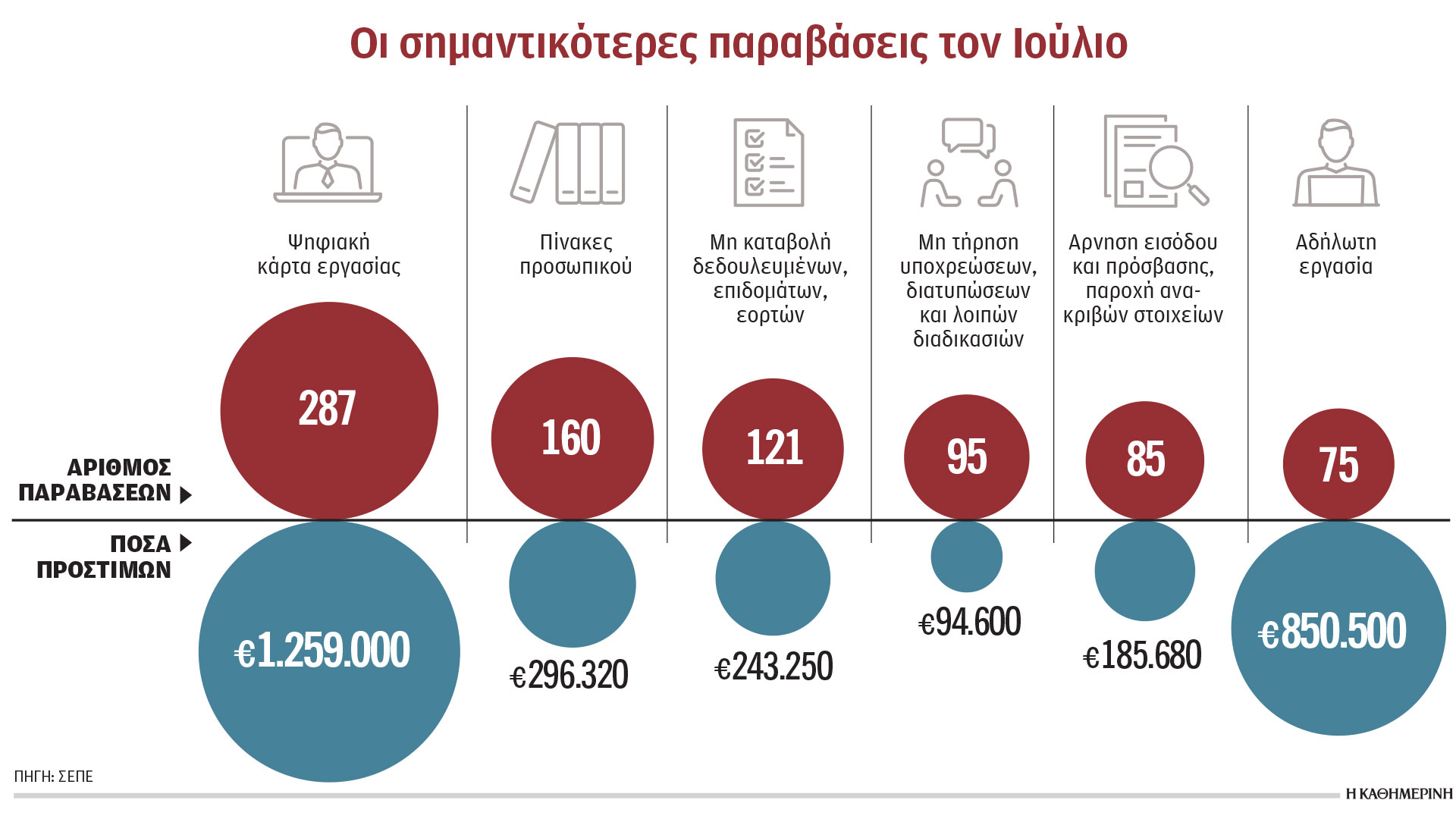 Παράλληλα, αυξάνονται και οι παραβάσεις που σχετίζονται με τη χρήση της ψηφιακής κάρτας, ενδεικτικό του μεγέθους του προβλήματος που εντοπίζεται στην αγορά εργασίας, με την καταγραφή του ωραρίου και των υπερωριών στον ιδιωτικό τομέα.