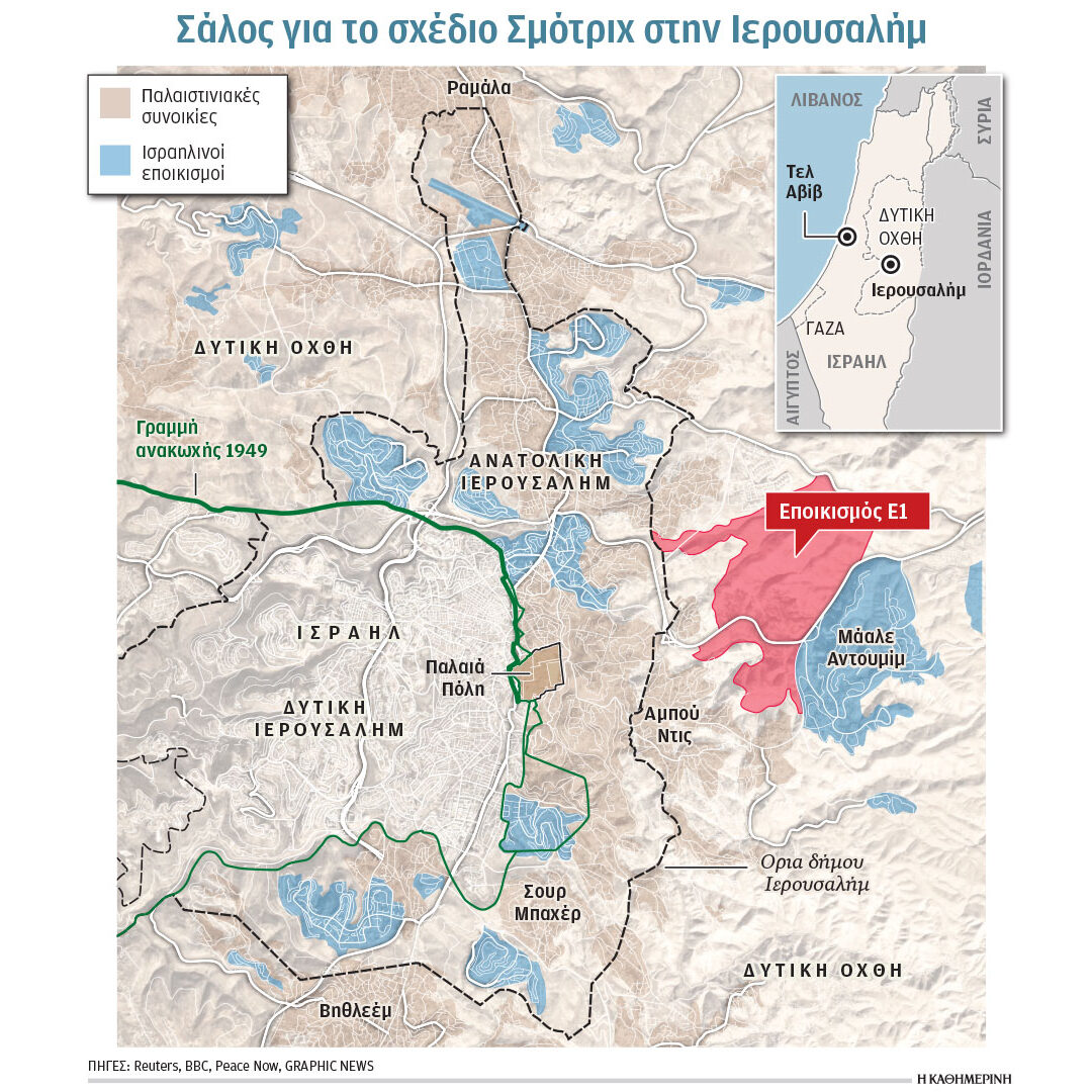 Κατά τη διάρκεια επίσκεψής του στον εποικισμό της Μάαλε Αντουμίμ την Πέμπτη, ο Σμότριχ –που μεγάλωσε σε παράνομο εβραϊκό εποικισμό– είπε ότι ο Ισραηλινός πρωθυπουργός Μπέντζαμιν Νετανιάχου και ο Αμερικανός πρόεδρος Ντόναλντ Τραμπ συμφώνησαν στην αναβίωση των σχεδίων κατασκευής του εποικισμού Ε1. Παρότι η έγκριση κατασκευής του έργου θα αποτελέσει το πρώτο κρίσιμο βήμα, παρατηρητές της ισραηλινής πολιτικής επισήμαναν χθες ότι ούτε το γραφείο του Νετανιάχου αλλά ούτε και το Στέιτ Ντιπάρτμεντ είχαν επιβεβαιώσει τη θριαμβευτική ανακοίνωση του Σμοτρίχ, ικανή να δημιουργήσει νέα εστία έντασης στη Δυτική Οχθη.