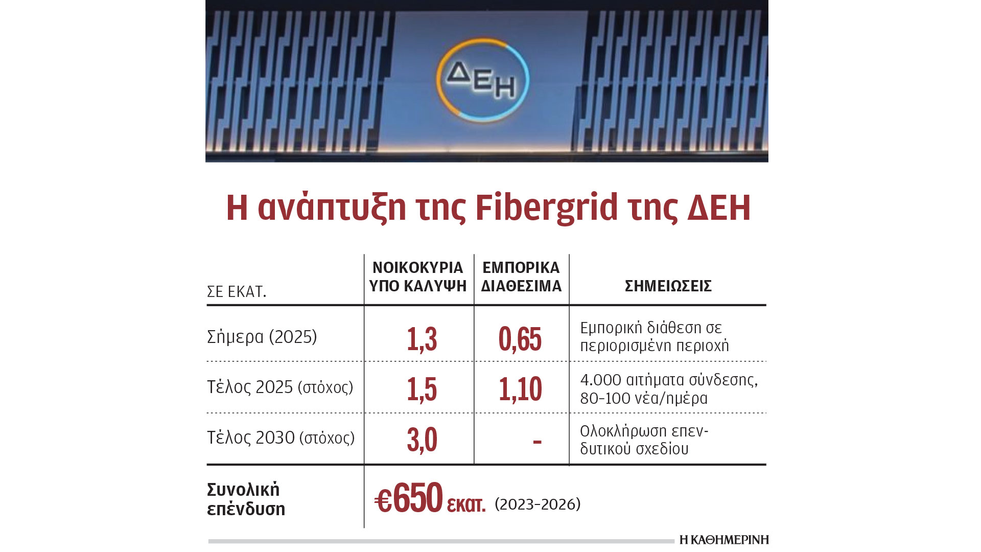 Εντός χρονοδιαγράμματος, η Fibergrid συνεχίζει να αναπτύσσει το δίκτυο υποδομών οπτικής ίνας μέχρι το σπίτι (Fiber-To-The-Home, FTTH) στην ελληνική επικράτεια. Η θυγατρική της ΔΕΗ, που δραστηριοποιείται στον τομέα των ηλεκτρονικών επικοινωνιών, προχωράει σύμφωνα με τους στόχους που έχει θέσει η διοίκηση του ομίλου, ενώ πρόσφατα δημοσίευσε τα οικονομικά αποτελέσματα για τη χρήση του 2024, μια χρονιά που σηματοδοτεί ουσιαστικά το πρώτο βήμα της δραστηριότητάς της. Πιο αναλυτικά, οι πωλήσεις έφθασαν σε 1,2 εκατ. ευρώ πέρυσι, ενώ σε επίπεδο καθαρού αποτελέσματος έκλεισε σε ζημίες 14,7 εκατ. ευρώ, κάτι που είναι αναμενόμενο καθώς η εταιρεία βρίσκεται σε φάση ανάπτυξης. Μέσα σε λιγότερο από δύο χρόνια, η εταιρεία έχει ήδη φτάσει να καλύπτει πάνω από 1,3 εκατ. σπίτια και επιχειρήσεις, καθιερώνοντάς την, όπως ανέφερε πρόσφατα στην ενημέρωση αναλυτών ο πρόεδρος και διευθύνων σύμβουλος της ΔΕΗ, Γιώργος Στάσσης, ως ένα από τα ταχύτερα αναπτυσσόμενα δίκτυα οπτικών ινών στην Ευρώπη σε επίπεδο υλοποίησης (deployment).