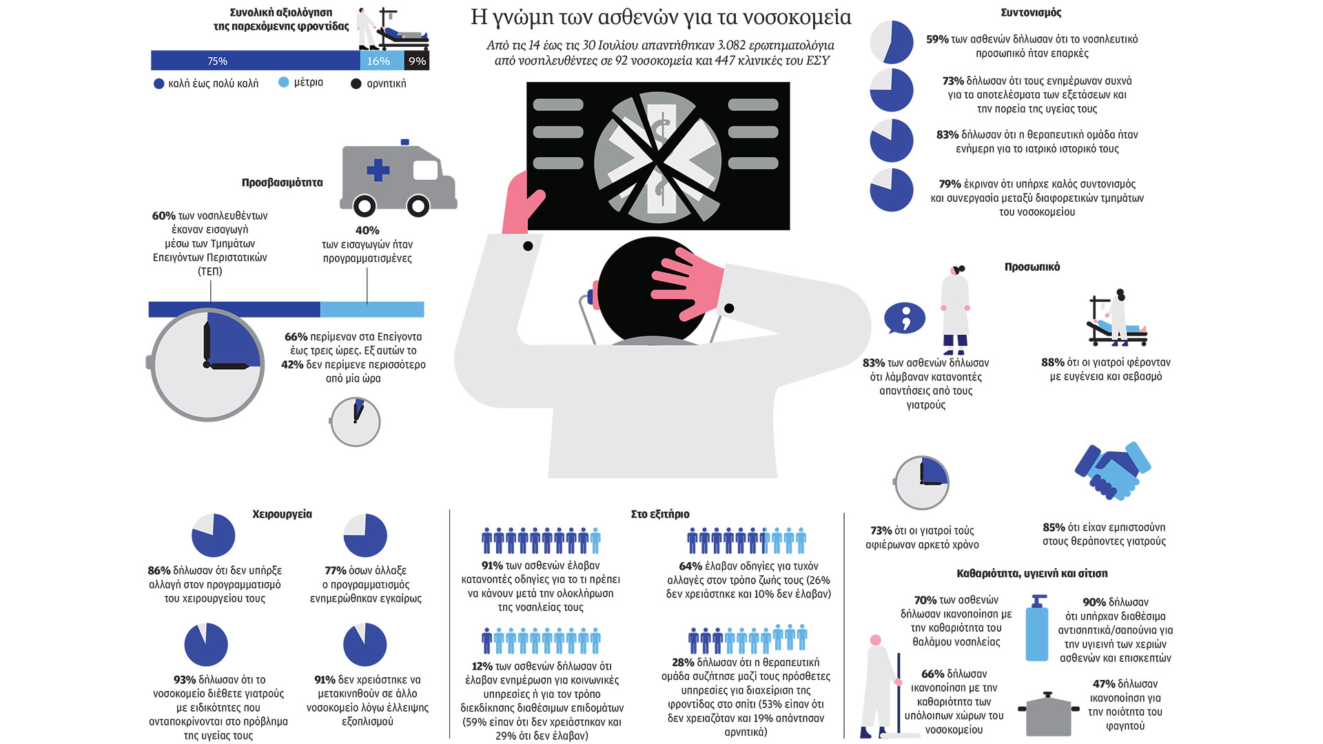 Από τις 14 έως τις 30 Ιουλίου είχαν απαντηθεί 3.082 ερωτηματολόγια από νοσηλευθέντες σε 92 νοσοκομεία και 447 κλινικές του ΕΣΥ. O μέσος όρος ικανοποίησης από τις υπηρεσίες που έλαβαν είναι 4,06 με άριστα το 5 (με βάση τις απαντήσεις στις ερωτήσεις που εμπεριέχουν βαθμολογία). Οσον αφορά τη συνολική αξιολόγηση της εμπειρίας τους από τη νοσηλεία, το 75% τη χαρακτήρισε καλή ή πολύ καλή, το 16% μέτρια και το 9% κακή.