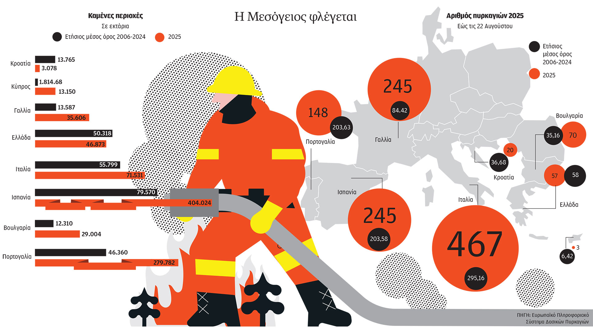 Τετραπλάσια σε σύγκριση με τον μέσο όρο της τελευταίας 20ετίας (2006-2024) είναι η έκταση που ήδη κάηκε φέτος στην Ευρωπαϊκή Ενωση. Σύμφωνα με τις δορυφορικές εκτιμήσεις του προγράμματος Copernicus, το καλοκαίρι του 2025 είναι μέχρι στιγμής το πιο καταστροφικό.