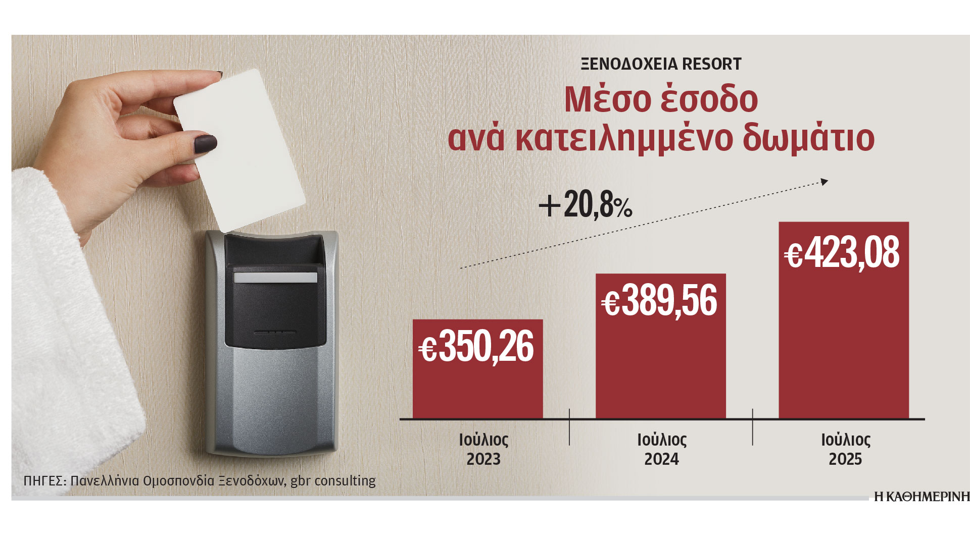 Συγκεκριμένα, η GBR Consulting αναφέρει ότι τα συνολικά ημερήσια έσοδα ανά κατειλημμένο δωμάτιο των ξενοδοχείων resort όλων των κατηγοριών ανά την Ελλάδα, που περιλαμβάνουν την τιμή του δωματίου αλλά και όλες τις δαπάνες που πραγματοποιούν οι ένοικοί του στα συγκροτήματα, διαμορφώθηκαν τον Ιούλιο στα 423,08 ευρώ από 389,56 ευρώ τον Ιούλιο του 2024 και 350,26 ευρώ τον Ιούλιο του 2023.