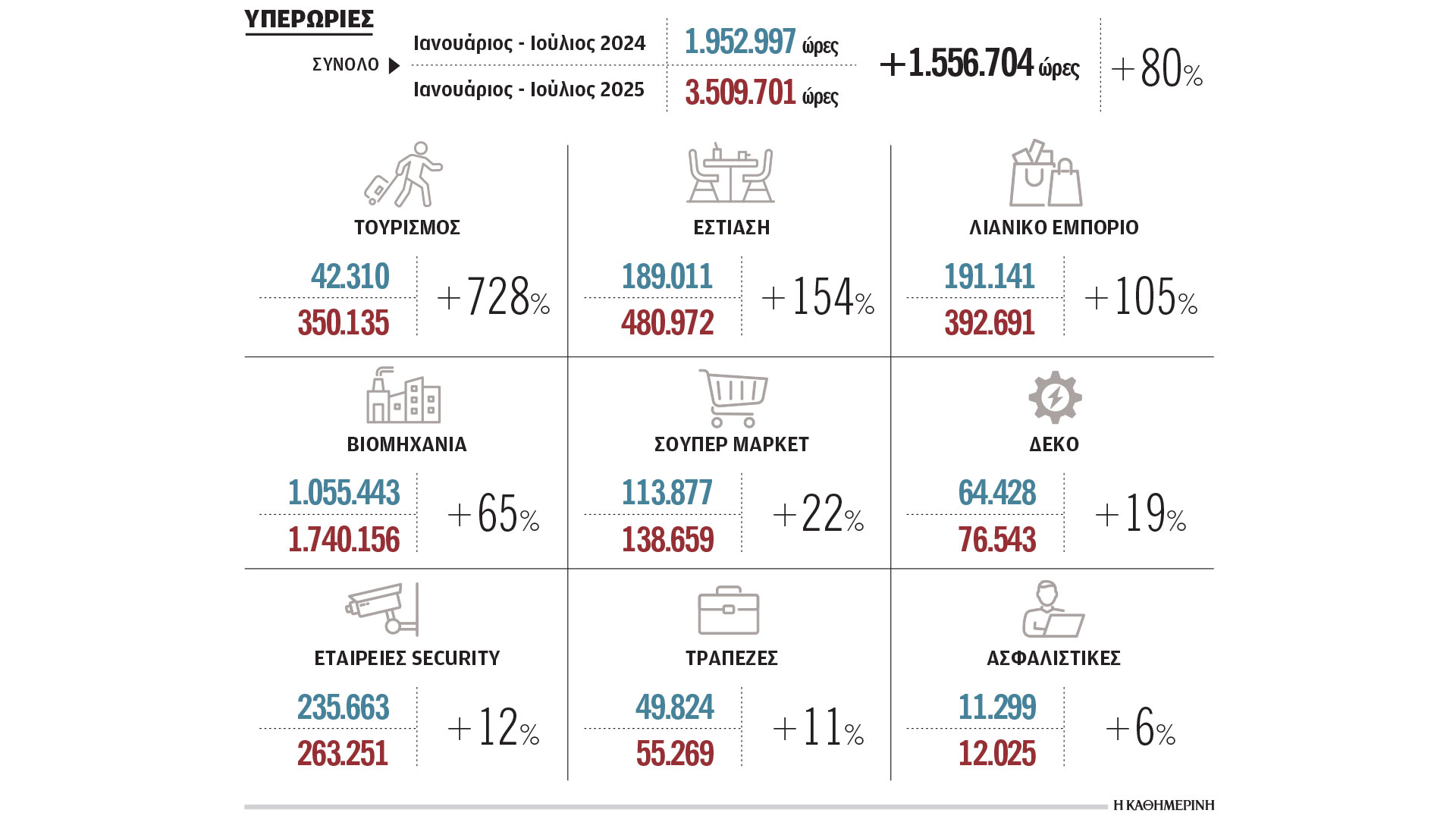 Οσον αφορά τον Ιούλιο, σε σχέση με τον αντίστοιχο μήνα του 2024, οι δηλωθείσες υπερωρίες αυξήθηκαν κατά 76% (+329.000), αγγίζοντας τις 763.000 ώρες. Στον τουρισμό, οι υπερωρίες που έγιναν υπερπενταπλασιάστηκαν (+541%), στην εστίαση τετραπλασιάστηκαν (+301%), στο λιανικό εμπόριο σχεδόν διπλασιάστηκαν (+89%), ενώ η βιομηχανία και οι υπόλοιποι κλάδοι κινήθηκαν σε ανοδική τροχιά, με μικρότερες αυξήσεις.