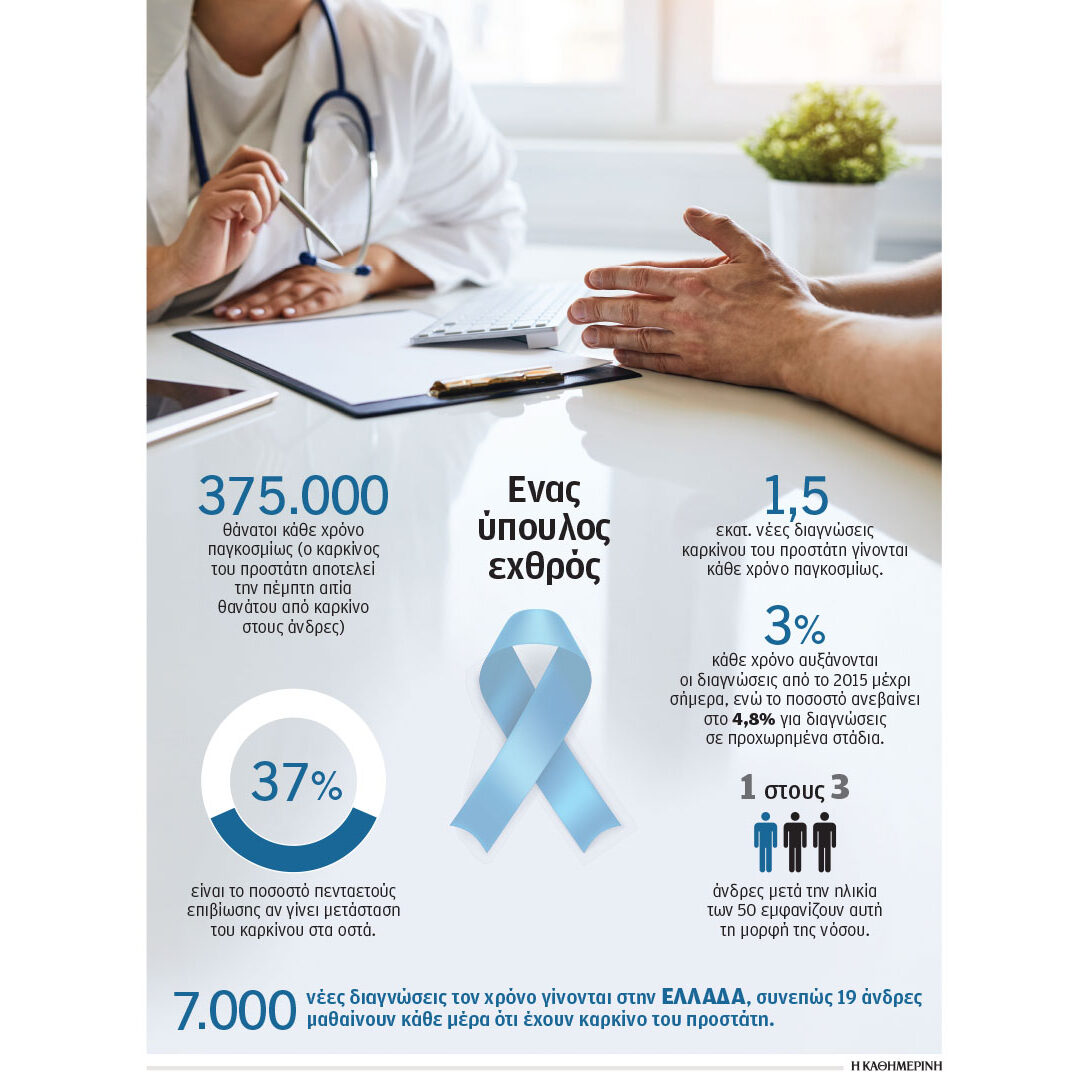 Για την Ελλάδα το Παγκόσμιο Παρατηρητήριο Καρκίνου (GCO) αναφέρει ότι γίνονται περισσότερες από 7.000 νέες διαγνώσεις τον χρόνο· συνεπώς 19 άνδρες μαθαίνουν ότι έχουν καρκίνο του προστάτη κάθε μέρα. «Στην Ευρώπη, σύμφωνα με τα στοιχεία του Παγκόσμιου Οργανισμού Υγείας (Globocan 2022), είναι ο δεύτερος συχνότερος καρκίνος στους άνδρες, με περίπου 500.000 νέα περιστατικά ετησίως. Τα υψηλότερα ποσοστά καταγράφονται στις βορειοευρωπαϊκές χώρες. Στην Ελλάδα τα ποσοστά είναι κάπως χαμηλότερα, αν και δυστυχώς δεν διαθέτουμε πλήρως αξιόπιστα δεδομένα», λέει ο Χρήστος Χριστοδούλου, φέρνοντας στο προσκήνιο, για μία ακόμα φορά, τα… Greek statistics και την ανάγκη, επιτέλους, να δημιουργηθεί (όχι στα χαρτιά) ένα εθνικό μητρώο καρκίνου.
