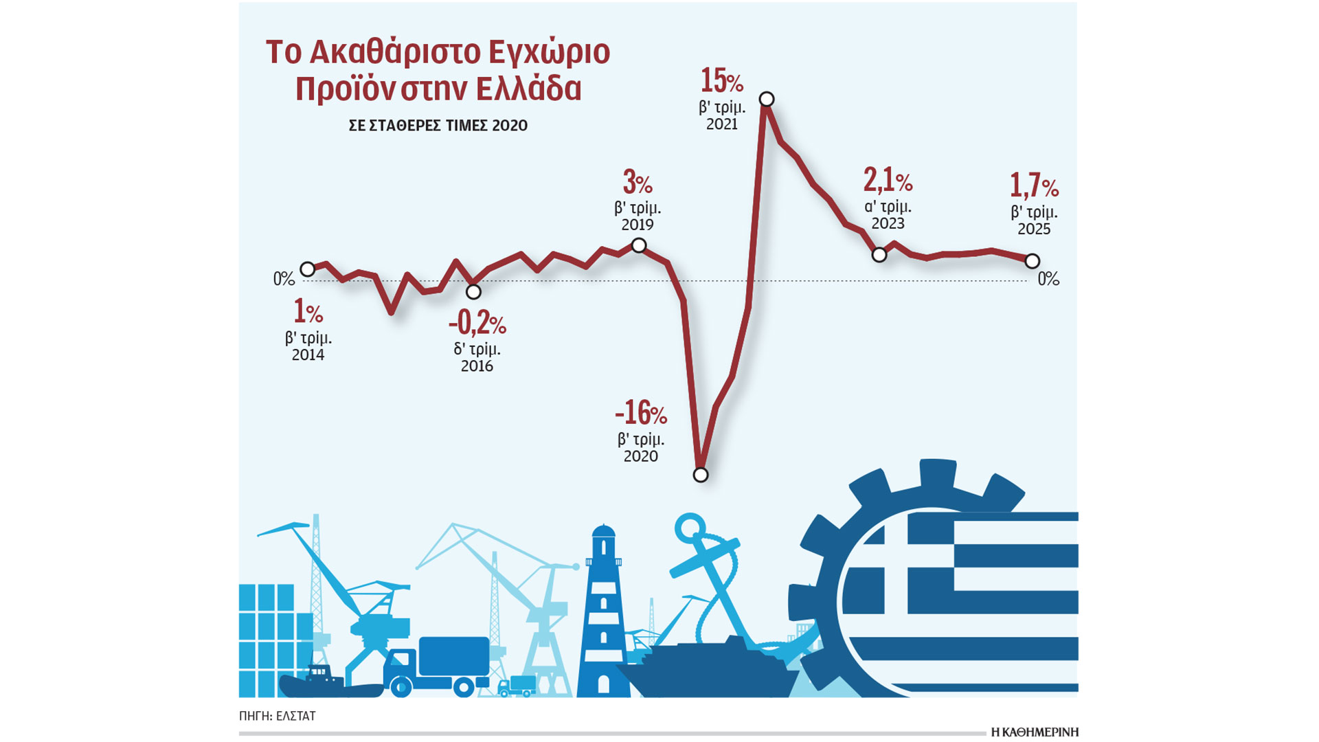 Το ΑΕΠ αυξήθηκε κατά 1,7% το β΄ τρίμηνο φέτος σε σύγκριση με την ίδια περίοδο του 2024, σύμφωνα με τα στοιχεία που ανακοίνωσε χθες η ΕΛΣΤΑΤ, σημειώνοντας επιβράδυνση σε σύγκριση με το α΄ τρίμηνο, όταν είχε αυξηθεί κατά 2,2%, σε σύγκριση με το α΄ τρίμηνο του 2024. Κύριες αιτίες αυτής της επιβράδυνσης, σύμφωνα με τους αναλυτές, ήταν η συγκράτηση του ρυθμού αύξησης της κατανάλωσης, καθώς και η διεθνής αβεβαιότητα, που επηρέασε αρνητικά τις εξαγωγές αγαθών και τα αποθέματα.