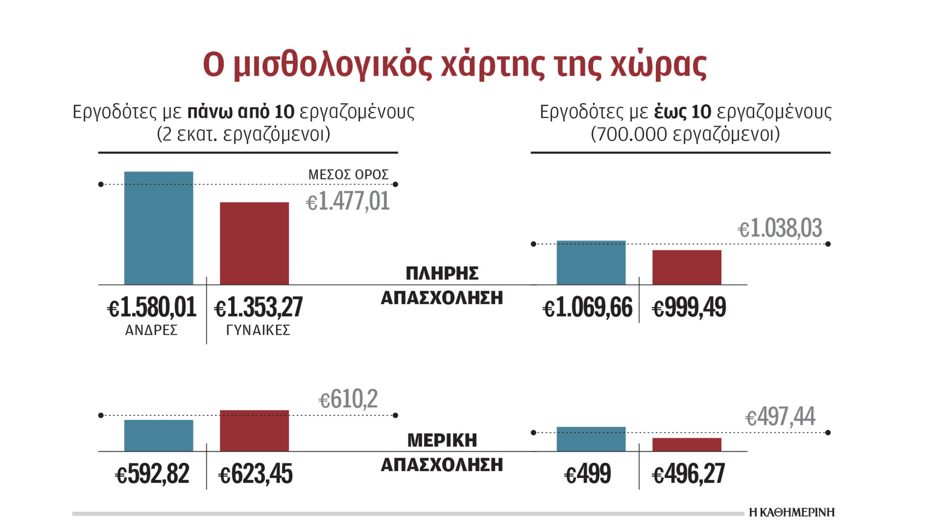 3. Η διαφορά στον μισθό με βάση το φύλο παραμένει επίσης σημαντική. Φτάνει περίπου στο 20% για το σύνολο της χώρας, καθώς ο μέσος μισθός των ανδρών φτάνει στα 1.289 ευρώ και των γυναικών στα 1.078 ευρώ. Στις μεγάλες επιχειρήσεις οι άνδρες αμείβονται με 1.418 ευρώ κατά μέσον όρο και οι γυναίκες με 1.181 ευρώ, ενώ στις μικρές η ψαλίδα είναι μικρότερη: 890 ευρώ για τους άνδρες και 784 ευρώ για τις γυναίκες, οι οποίες διαπιστώνεται ότι καταλαμβάνουν μεγαλύτερο μερίδιο στη μερική απασχόληση.
