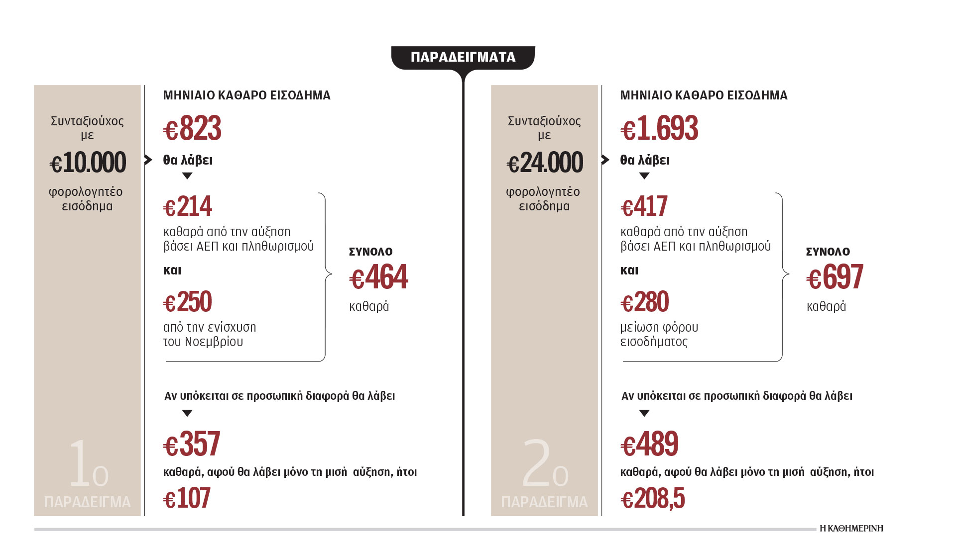 • Συνταξιούχος με 10.000 ευρώ φορολογητέο εισόδημα και μηνιαίο καθαρό εισόδημα 823 ευρώ, θα λάβει 214 ευρώ καθαρά από την αύξηση βάσει ΑΕΠ και πληθωρισμού και 250 ευρώ από την ενίσχυση του Νοεμβρίου, σύνολο 464 ευρώ καθαρά. Αν υπόκειται σε προσωπική διαφορά, θα λάβει 357 ευρώ καθαρά.