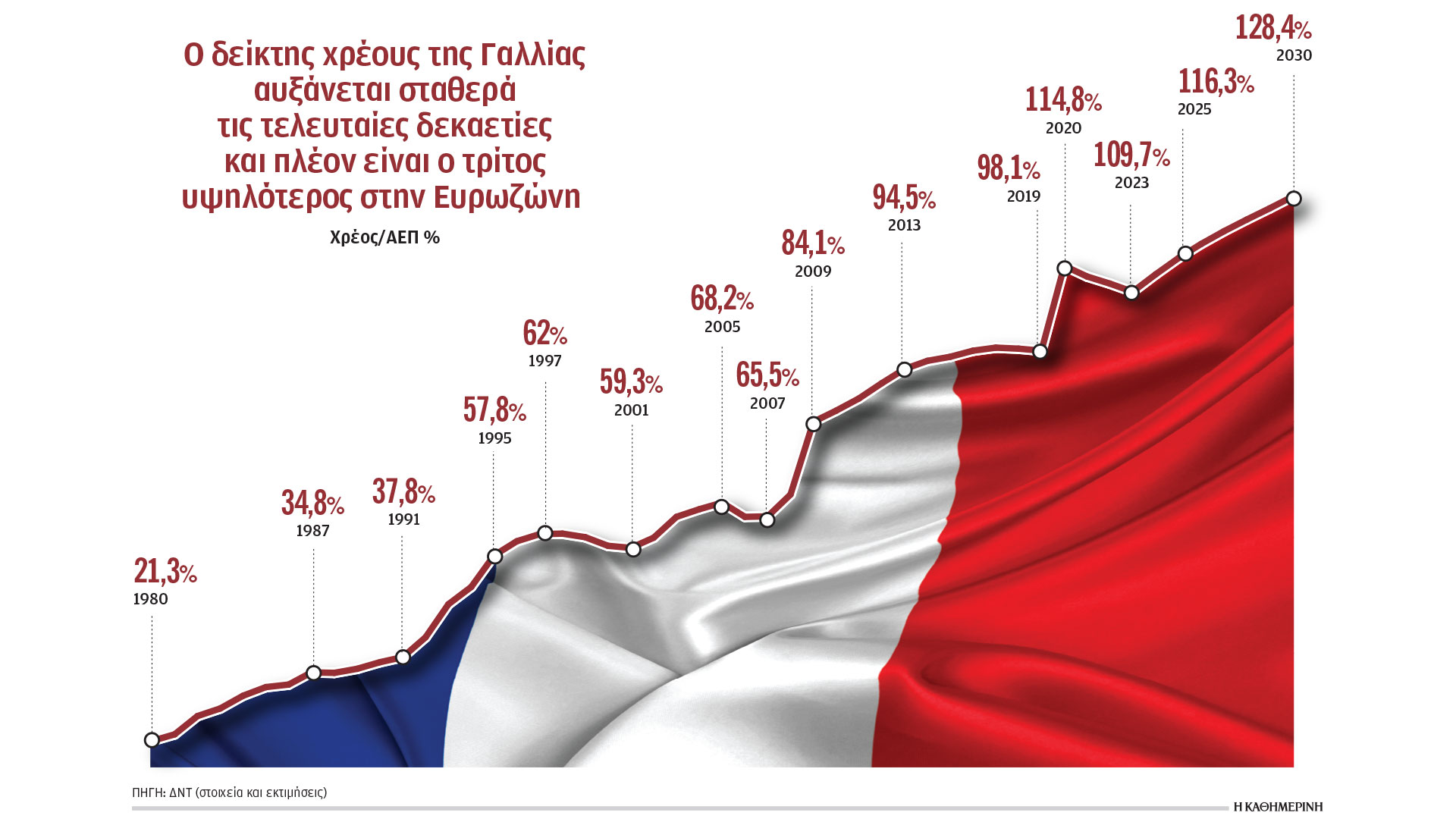 Η Γαλλία βυθίζεται όλο και περισσότερο σε ένα τέλμα αδύναμης ανάπτυξης, υψηλού κόστους δανεισμού και ενός «βουνού» χρέους, που πλέον είναι από τα υψηλότερα στην Ευρώπη. Η δεύτερη μεγαλύτερη οικονομία της Ευρωζώνης έχει γίνει «το προβληματικό παιδί» ολόκληρης της Ευρώπης για τις χρηματοπιστωτικές αγορές, παίρνοντας τη θέση της Ιταλίας, που πριν από λίγα χρόνια είχε «διαδεχθεί» την Ελλάδα, και έτσι πλέον δανείζεται ακριβότερα από ό,τι το ελληνικό Δημόσιο και με «ίσους όρους» σε σχέση με το ιταλικό.