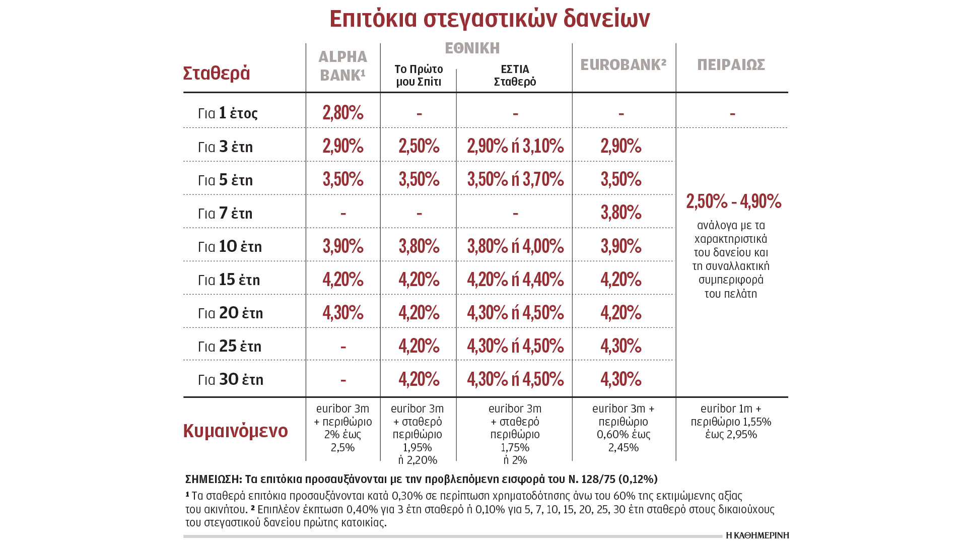 Σε μειώσεις προχώρησε και η Εθνική Τράπεζα, μειώνοντας έως και 0,15 τα σταθερά επιτόκια, που ξεκινούν από 2,90% και φτάνουν έως 4,50%, ενώ η μείωση στα κυμαινόμενα επιτόκια φτάνει έως και 0,25 μονάδες. Η τράπεζα συνεχίζει την προσφορά του προγράμματος «Το πρώτο μου Σπίτι» που απευθύνεται σε όσους δεν έχουν ξεπεράσει το 50ό έτος της ηλικίας τους, δίνοντας τη δυνατότητα επιλογής σταθερού επιτοκίου που ξεκινά από 2,5% και φτάνει έως και 4,20% για διάρκεια από 15 έως 30 χρόνια. Οι δανειολήπτες αυτής της κατηγορίας απαλλάσσονται από τη δαπάνη εξέτασης αιτήματος και μπορούν να λάβουν επιπλέον χρηματοδότηση μέσω του προσωπικού δανείου Εξπρές με ευνοϊκούς όρους χρηματοδότησης, εφόσον η οικονομική δυνατότητά τους το επιτρέπει.