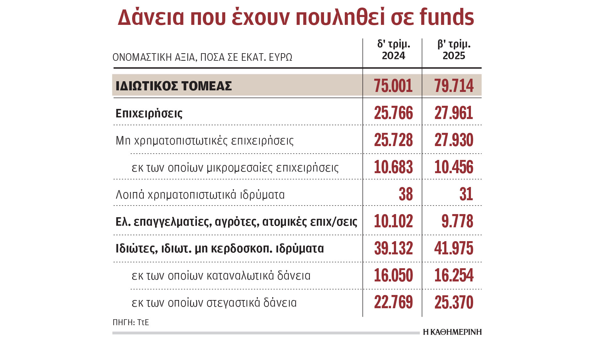 Στα 80 δισ. ευρώ περίπου ανήλθαν στο τέλος του α΄ εξαμήνου τα δάνεια που έχουν πουληθεί από τις τράπεζες σε funds, παρουσιάζοντας περαιτέρω άνοδο κατά 6% σε σχέση με το 2024. Το μεγαλύτερο μέρος του χρέους που έχει μεταφερθεί στα funds βαρύνει τα νοικοκυριά, οι οφειλές των οποίων φτάνουν τα 42 δισ. ευρώ περίπου, ενώ άλλα 28 δισ. ευρώ περίπου βαρύνουν τις επιχειρήσεις και άλλα 9,8 δισ. ευρώ τους ελεύθερους επαγγελματίες. Παρά το γεγονός ότι οι τράπεζες έχουν μεταφέρει το μεγαλύτερο μέρος των κόκκινων δανείων που είχαν στο παρελθόν μέσω των τιτλοποιήσεων του προγράμματος «Ηρακλής», οι πωλήσεις μικρότερων χαρτοφυλακίων συνεχίστηκαν και το α΄ εξάμηνο του 2025, ενώ μέρος της αύξησης που καταγράφουν τα στοιχεία της ΤτΕ προέρχεται από την πώληση του χαρτοφυλακίου δανείων της PQH, που μεταβιβάστηκε εντός του 2025. Μέσω των τιτλοποιήσεων του προγράμματος «Ηρακλής» οι τράπεζες πέτυχαν σημαντική μείωση των δεικτών μη εξυπηρετούμενων δανείων, από το 48,5% το 2016 σε μονοψήφιο δείκτη το 2025, αλλά το χρέος παραμένει στην οικονομία και βαρύνει πάνω από 2,5 εκατ. οφειλέτες, οι οποίοι είναι αποκλεισμένοι από το τραπεζικό σύστημα. Σύμφωνα με τα αναλυτικά στοιχεία της ΤτΕ, οι οφειλές των νοικοκυριών είναι κυρίως από στεγαστικά δάνεια, που φτάνουν στα 25,4 δισ. ευρώ, πολλά από τα οποία έχουν ενταχθεί στον νόμο Κατσέλη και αφορούν πρώτη κατοικία, ενώ άλλα 16,2 δισ. ευρώ είναι οφειλές από καταναλωτικά δάνεια. Από τα 27,9 δισ. ευρώ που είναι το χρέος των επιχειρήσεων, τα 10,4 δισ. ευρώ είναι οφειλές μικρομεσαίων επιχειρήσεων.