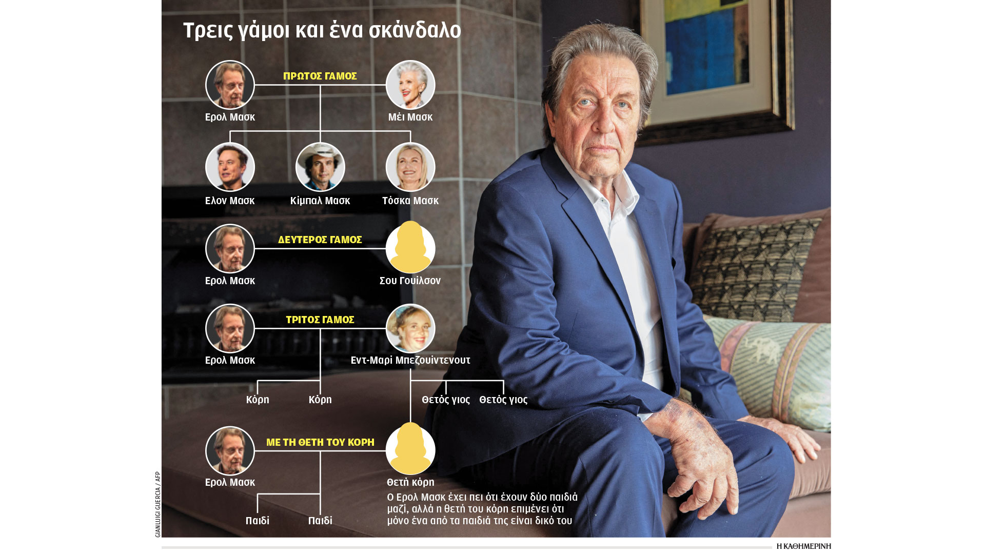 Ανέφερε ότι η κύρια οικονομική της στήριξη προέρχεται από τον Ελον Μασκ. «Ο Ελον ήταν πάντα στο πλευρό μου», είπε. Γεννημένος και μεγαλωμένος στην Πραιτώρια, πρωτεύουσα της Νότιας Αφρικής, ο Ερολ Μασκ έγινε γνωστός ως επιχειρηματίας στα 20 του. Το 1970 παντρεύτηκε τη Μέι Χάλντεμαν, διατροφολόγο και μοντέλο. Εκαναν τρία παιδιά: τον Ελον, την Τόσκα, η οποία τώρα διευθύνει υπηρεσία streaming για ερωτικές ταινίες, και τον Κίμπαλ, που έγινε επιχειρηματίας.