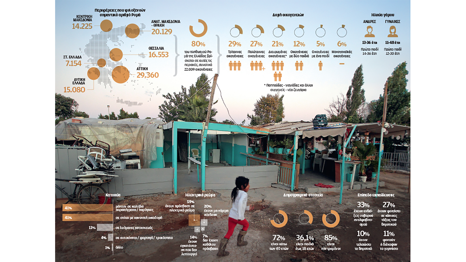 Οι Ελληνες Ρομά είναι κυρίως νεανικός πληθυσμός. Σε μεγάλο ποσοστό ζουν σε καταλύματα που δεν πληρούν τους όρους υγιεινής και επιβιώνουν είτε κάνοντας μεροκάματα όπου μπορούν είτε από τα κρατικά επιδόματα στήριξης. Εχουν χαμηλή έως και καθόλου εκπαίδευση και μεγάλη έλλειψη εξειδίκευσης, γεγονός που, σε συνδυασμό και με τα στερεότυπα που τους συνοδεύουν, τους δυσκολεύει να έχουν πρόσβαση στην αγορά εργασίας και έτσι να βελτιώσουν την κοινωνική και οικονομική θέση τους.