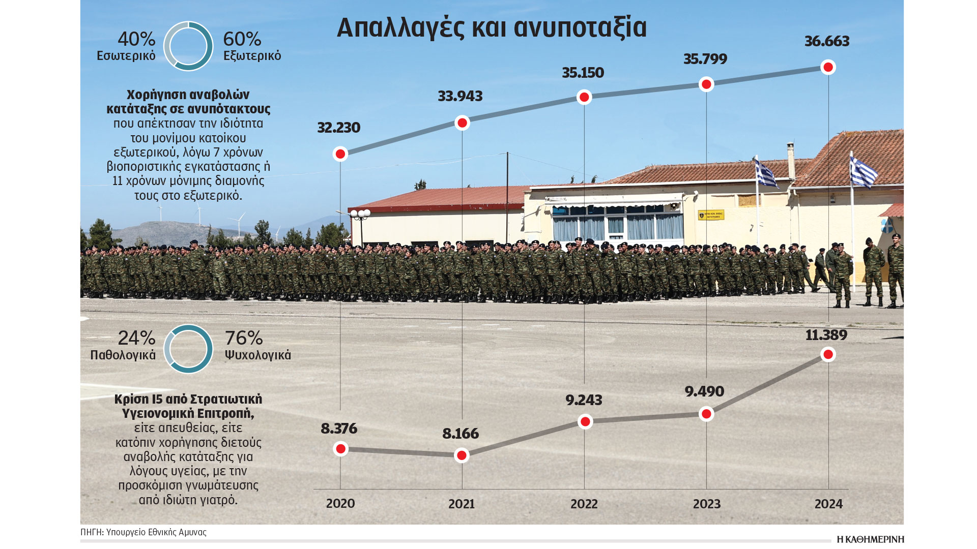 Ενδεικτικό της μαζικότητας της φυγοστρατίας τα τελευταία χρόνια είναι ότι μόνο την τελευταία τριετία περίπου 30.000 στρατεύσιμοι μετέπεσαν στην κατηγορία Ι5, με το 76% εξ αυτών για ψυχολογικούς λόγους, ενώ την τελευταία πενταετία αυξάνεται και ο αριθμός των ανυπότακτων –εσωτερικού και εξωτερικού–, οι οποίοι το 2024 ξεπέρασαν τις 36.000.