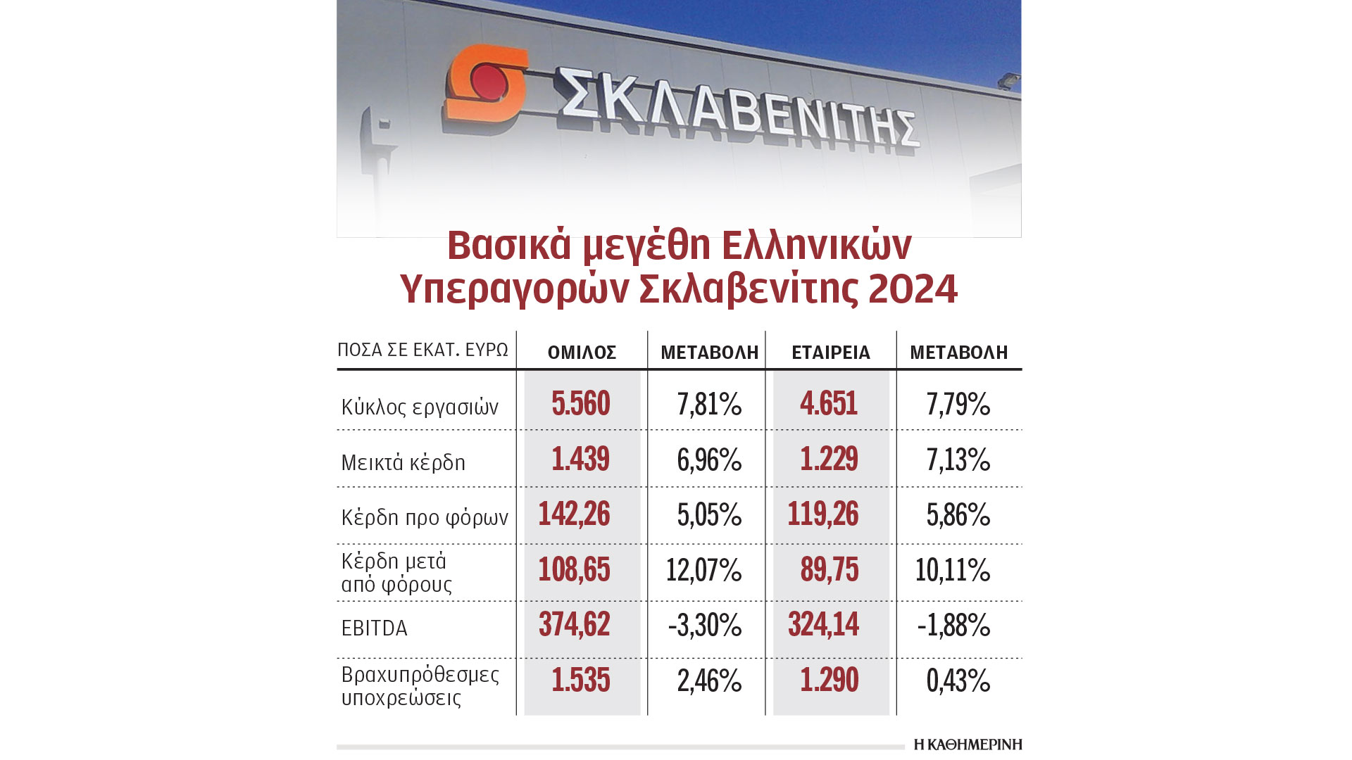 Σύμφωνα με τα οικονομικά αποτελέσματα που δημοσιοποίησε χθες, ο κύκλος εργασιών σε επίπεδο ομίλου (σ.σ. περιλαμβάνει τη δραστηριότητα σε Ελλάδα και Κύπρο των καταστημάτων «Σκλαβενίτης», «Χαλκιαδάκης», The Mart Cash & Carry στην Ελλάδα, καθώς και «Σκλαβενίτης» και «Παπαντωνίου» στην Κύπρο) αυξήθηκε το 2024 κατά 7,81% και διαμορφώθηκε σε 5,56 δισ. ευρώ, από 5,16 δισ. ευρώ το 2023. Ο κύκλος εργασιών της μητρικής διαμορφώθηκε σε 4,65 δισ. ευρώ, ενισχυμένος κατά 7,79%, όταν ο ρυθμός ανάπτυξης του κλάδου το 2024 ήταν 2,8%.