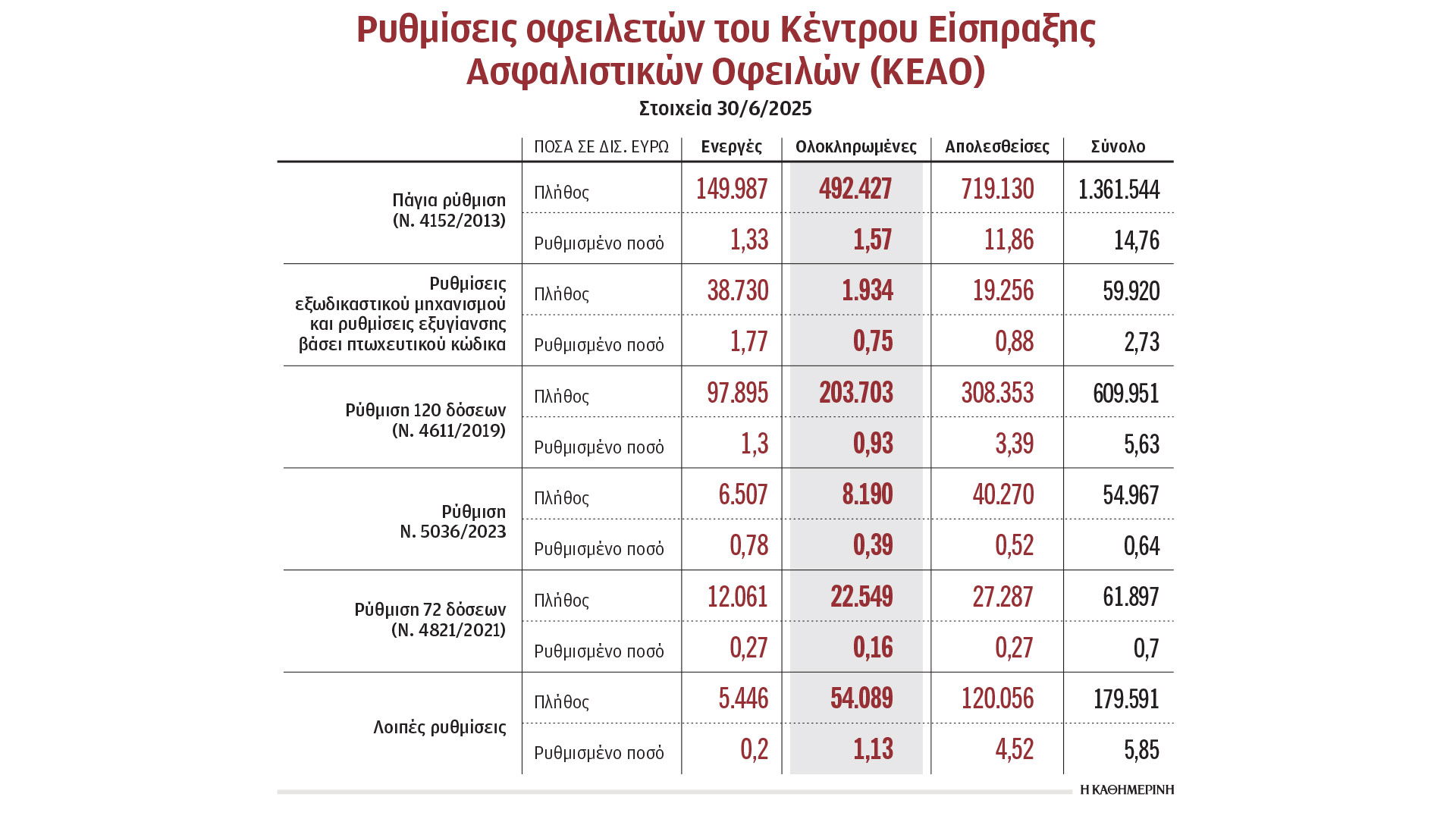 Συνολικά, μέχρι τον Ιούνιο 2025 είχαν υπαχθεί σε κάποια μορφή ρύθμισης οφειλές ύψους 30,3 δισ. ευρώ. Το ποσό αυτό αντιστοιχεί περίπου στο 60% του συνόλου των ληξιπρόθεσμων οφειλών που διαχειρίζεται το ΚΕΑΟ (50,3 δισ. ευρώ).