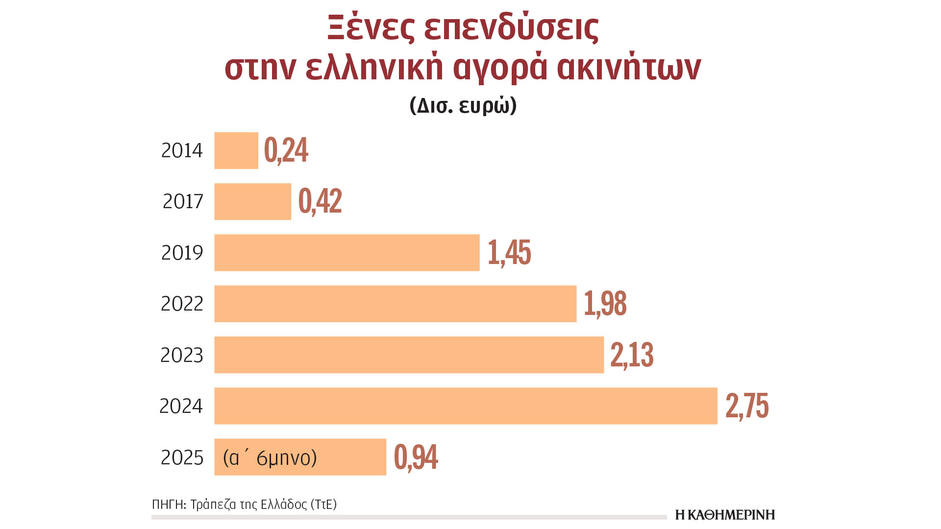 Διευκρινίζεται ότι πτώση παρατηρήθηκε και το 2020 λόγω της πανδημικής κρίσης, όπου ήταν επόμενο να σημειωθεί κάμψη της σχετικής δραστηριότητας. Μάλιστα, από το 2010 μέχρι και το 2024 η πορεία των ξένων επενδύσεων στην αγορά ακινήτων είναι σταθερά ανοδική, με εξαίρεση άλλη μια χρονιά, το 2015, που και πάλι υπήρξε η έκτακτη συνθήκη των κεφαλαιακών ελέγχων (capital controls). Κατά τη διάρκεια των ετών αυτών, οι ετήσιες εισροές ξεκίνησαν από τα μόλις 63 εκατ. του 2010, εν μέσω της κρίσης χρέους της χώρας κι έφτασαν πέρυσι στο ιστορικό υψηλό των 2,75 δισ.