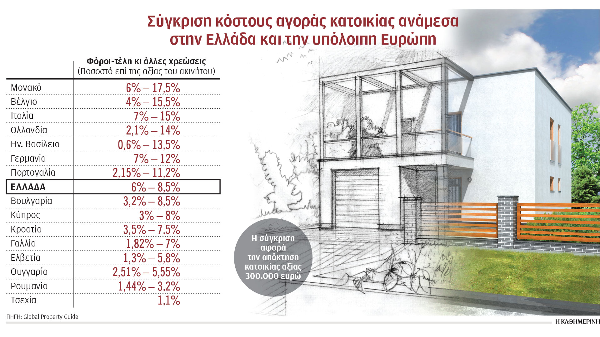 Αυτό αποδεικνύεται και από το γεγονός ότι σε σύγκριση με την υπόλοιπη Ευρώπη η Ελλάδα «φιγουράρει» μεταξύ των υψηλότερων θέσεων σε ό,τι αφορά τις επιβαρύνσεις που συνοδεύουν την απόκτηση κατοικίας. Συγκεκριμένα, με βάση τα στοιχεία της Global Property Guide, ένας αγοραστής από το εξωτερικό ή όποιος Ελληνας αγοραστής δεν έχει απαλλαγή λόγω πρώτης κατοικίας, θα πρέπει να υπολογίζει ότι ένα ποσοστό από 6% έως 8,5% της αξίας του ακινήτου αφορά τα έξοδα μεταβίβασης. Αυτό σημαίνει ότι για την αγορά κατοικίας αξίας 300.000 ευρώ, ενδέχεται να απαιτηθούν επιπλέον 25.500 ευρώ για να ολοκληρωθεί η αγοραπωλησία.