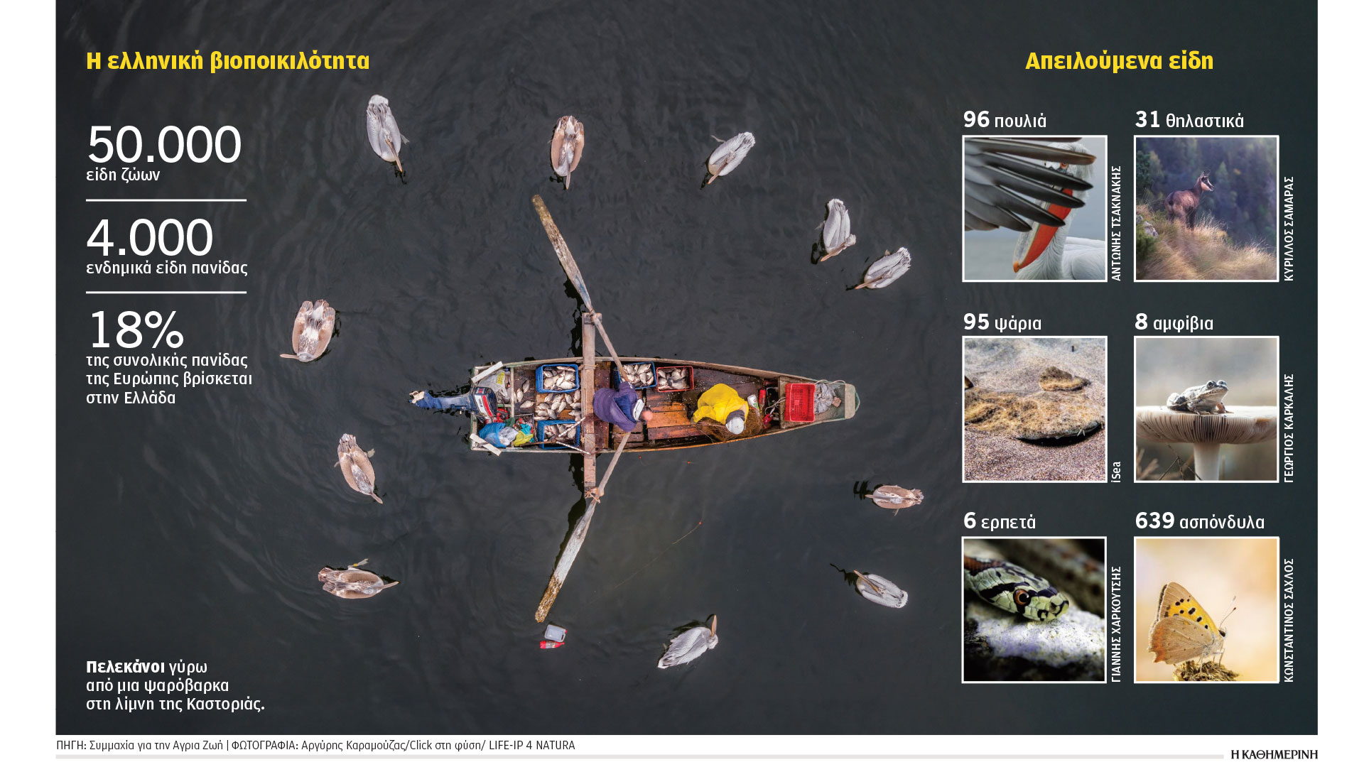 Σύμφωνα με την τελευταία ανανέωση του «κόκκινου καταλόγου» από τον Οργανισμό Φυσικού Περιβάλλοντος (ΟΦΥΠΕΚΑ), ως απειλούμενα χαρακτηρίζονται στη χώρα μας 96 είδη πουλιών, 31 θηλαστικά, 95 ψάρια, 8 αμφίβια, 6 ερπετά και 639 ασπόνδυλα. «Γιατί; Κυρίως λόγω της ανθρώπινης δραστηριότητας, που οδήγησε σε καταστροφή των ενδιαιτημάτων, ρύπανση, υπερεκμετάλλευση των φυσικών πόρων. Και βέβαια, την κλιματική αλλαγή», εξήγησε η κ. Μαραγκού.