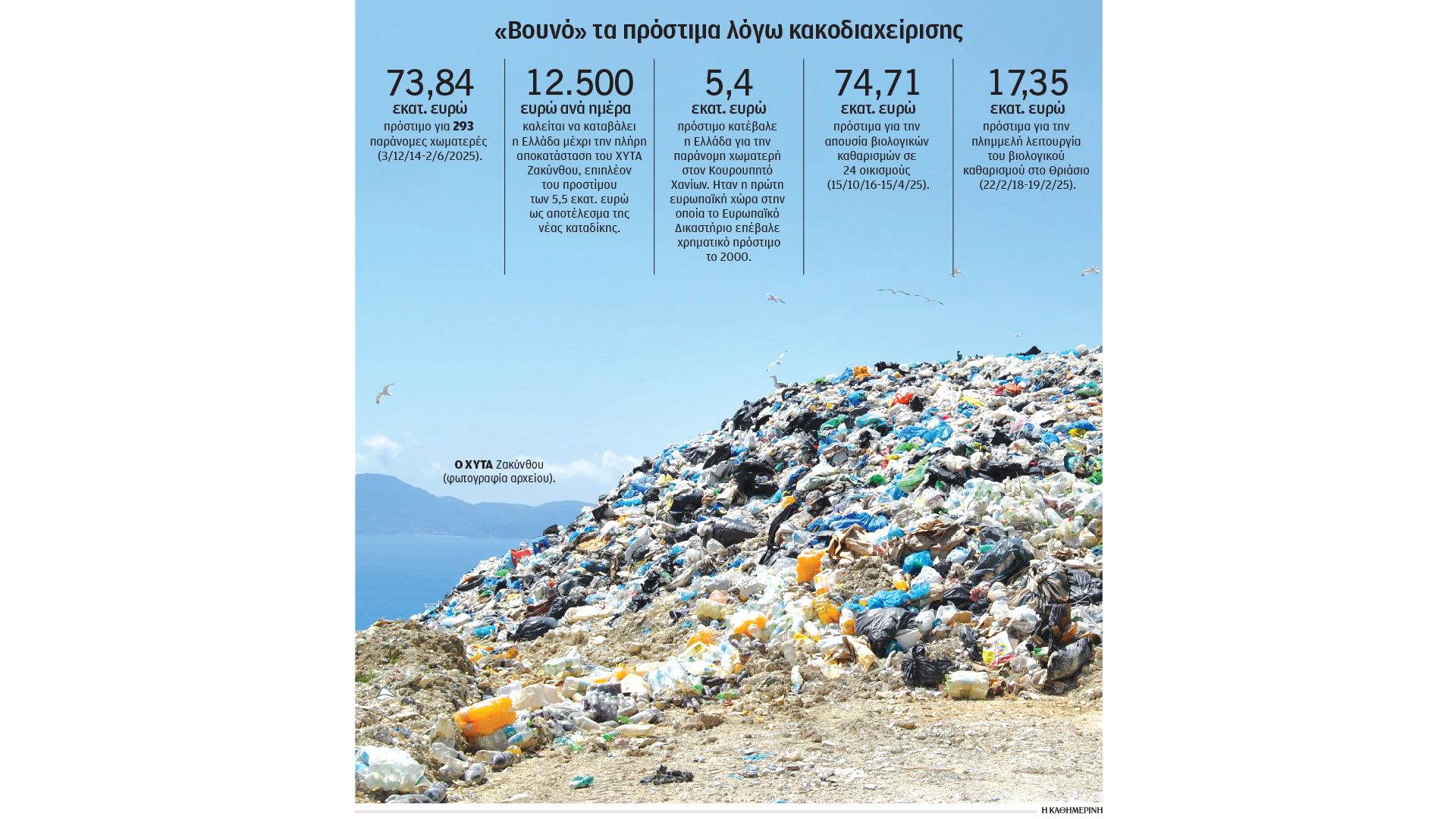 Οπως ανακοίνωσε χθες το Ευρωπαϊκό Δικαστήριο, η Ελλάδα καταδικάστηκε σε κατ’ αποκοπήν πρόστιμο 5,5 εκατ. ευρώ, το οποίο θα προσαυξάνεται κατά 12.500 ευρώ για κάθε ημέρα μέχρι την αποκατάσταση του ΧΥΤΑ Ζακύνθου. Η Ελλάδα καταδικάστηκε για πρώτη φορά το 2014 καθώς «διατηρούσε στη Ζάκυνθο σε λειτουργία έναν δυσλειτουργικό και κορεσμένο ΧΥΤΑ» και επιπλέον είχε ανανεώσει την άδεια λειτουργίας του, κατά παράβαση της οδηγίας για τους φυσικούς οικοτόπους (ο ΧΥΤΑ βρίσκεται μέσα στο εθνικό πάρκο Ζακύνθου).