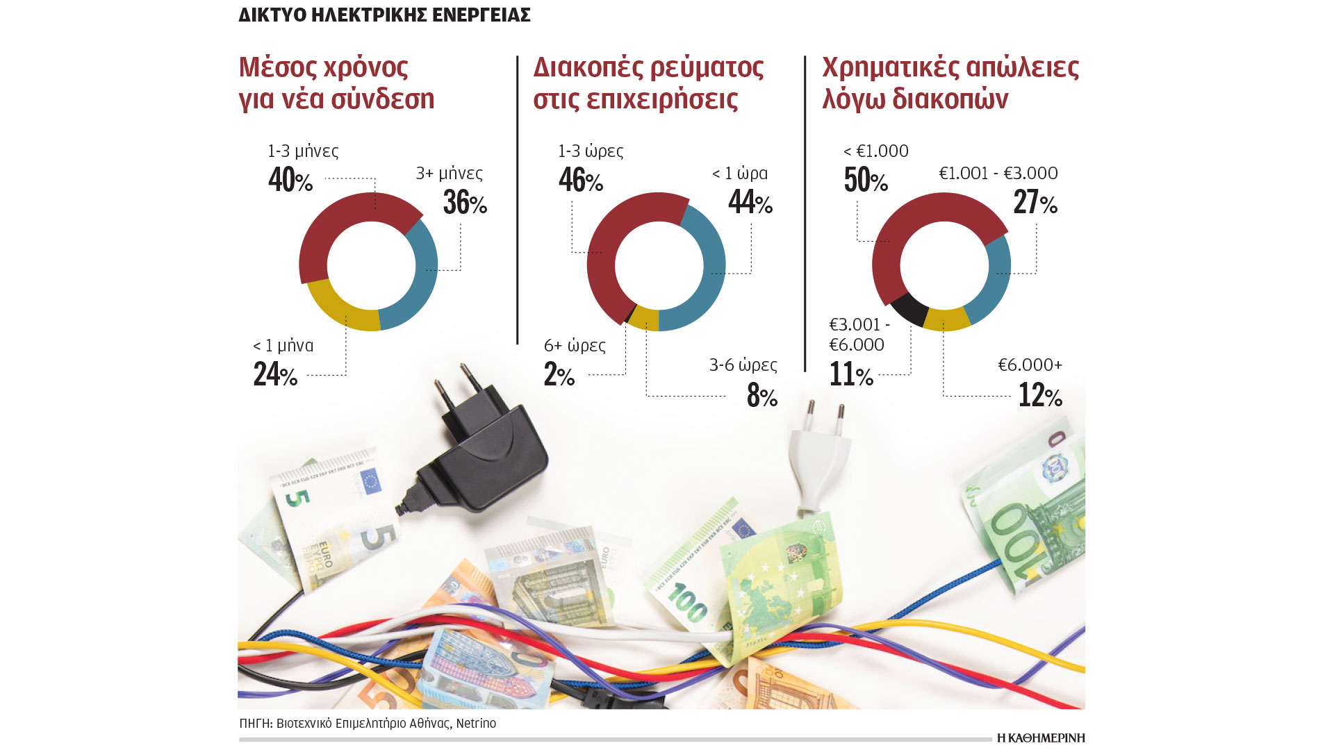 Τρεις μήνες κατά μέσον όρο θα πρέπει να περιμένουν οι επιχειρήσεις για να συνδεθούν στο δίκτυο του ηλεκτρικού ρεύματος, χρόνος που μεταφράζεται σε απώλεια εσόδων, κερδών και φυσικά παραγωγής. Ακόμη, όμως, και όσες επιχειρήσεις είναι ήδη συνδεδεμένες στο δίκτυο αντιμετωπίζουν συχνά προβλήματα διακοπών και ακόμη συχνότερα προβλήματα πτώσης της τάσης, με συνέπεια τη διακοπή της παραγωγής, την καταστροφή μηχανημάτων, αλλά και την καταστροφή πρώτων υλών, από τρόφιμα έως υλικά συσκευασίας, κάτι που μεταφράζεται σε πολλές χιλιάδες ευρώ. «Διατηρώ φούρνο ο οποίος λειτουργεί εδώ και 52 χρόνια. Για πρώτη φορά στη διάρκεια αυτών των 52 ετών δεν παρήχθη ψωμί λόγω βλάβης στο δίκτυο η οποία αποκαταστάθηκε την επόμενη ημέρα», είπε χαρακτηριστικά χθες ο κ. Ιωάννης Μάνος, α΄ αντιπρόεδρος του Βιοτεχνικού Επιμελητηρίου Αθηνών (ΒΕΑ).