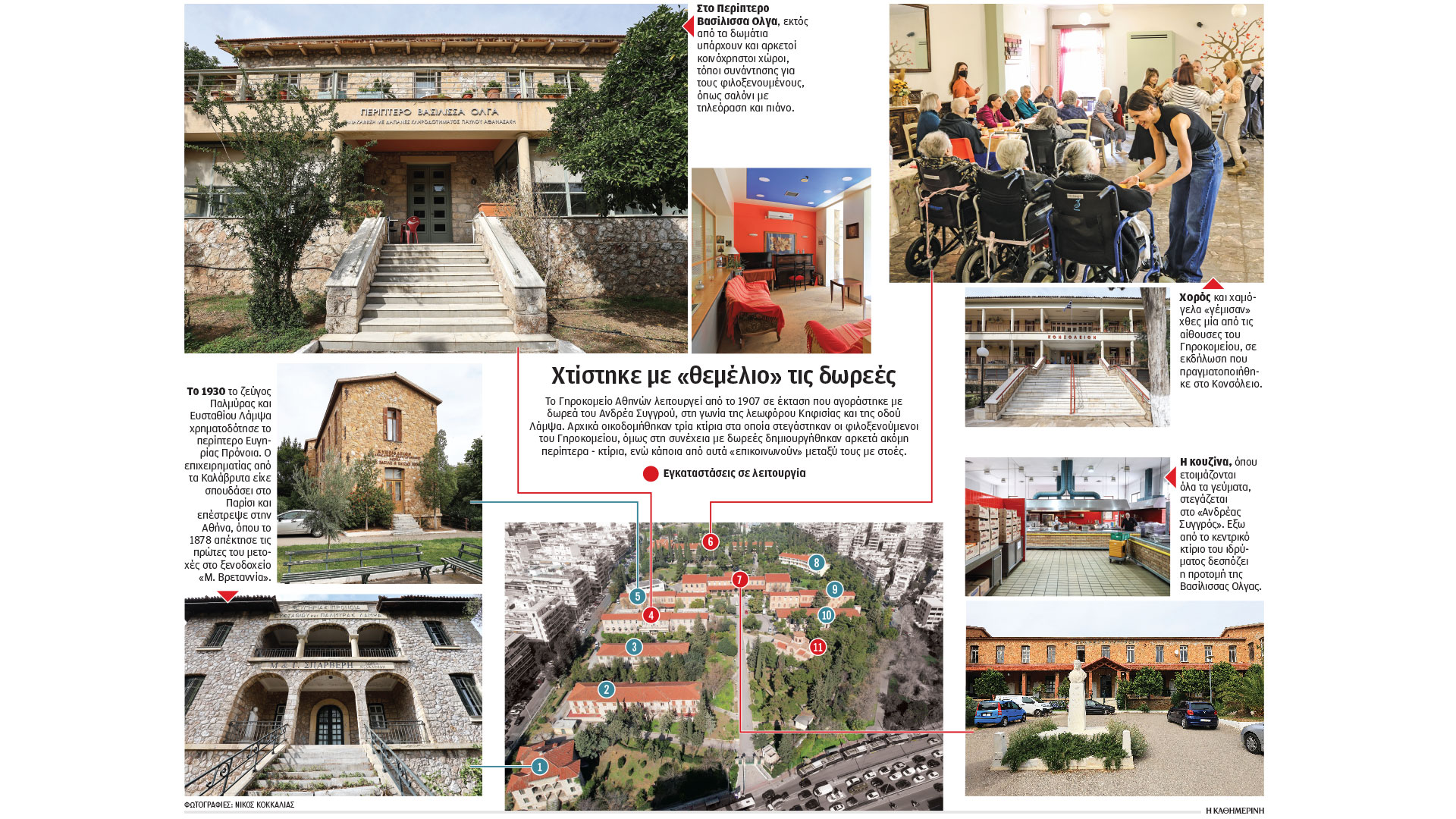 Η πρόσφατη κόντρα μεταξύ του δημάρχου Αθηναίων και της υπουργού Κοινωνικής Συνοχής και Οικογένειας Δόμνας Μιχαηλίδου για την εποπτεία της διαχείρισης του Γηροκομείου Αθηνών, αποτελεί μια ακόμα συνέχεια στην ιστορία του πτωχοκομείου που συστάθηκε το 1864 για να παρέχει στέγη, φαγητό και φροντίδα στους πολίτες που ήταν άποροι. Στο σημείο όπου βρίσκεται σήμερα στη συμβολή της λεωφόρου Κηφισίας και της οδού Λάμψα, λειτουργεί από το 1907 σε έκταση που αγοράστηκε με δωρεά του Ανδρέα Συγγρού. Αρχικά οικοδομήθηκαν τρία κτίρια στα οποία στεγάστηκαν οι φιλοξενούμενοι του Γηροκομείου, στη συνέχεια όμως και με δωρεές και άλλων εύπορων πολιτών δημιουργήθηκαν αρκετά ακόμα περίπτερα – κτίρια, καθένα από τα οποία φέρει και το όνομα που δείχνει την προέλευση και την ιστορία του. Το κεντρικό κτίριο – περίπτερο «Ανδρέας Συγγρός», επιφανείας 1.854 τετραγωνικών, είναι πετρόχτιστο, διαθέτει μεγάλη σκεπαστή είσοδο με τριγωνική όψη και αποτελεί το σήμα κατατεθέν του Γηροκομείου. Κάποια κτίρια επικοινωνούν με στοές και διαθέτουν μεγάλες τζαμαρίες που εξασφαλίζουν φυσικό φωτισμό στο εσωτερικό τους.