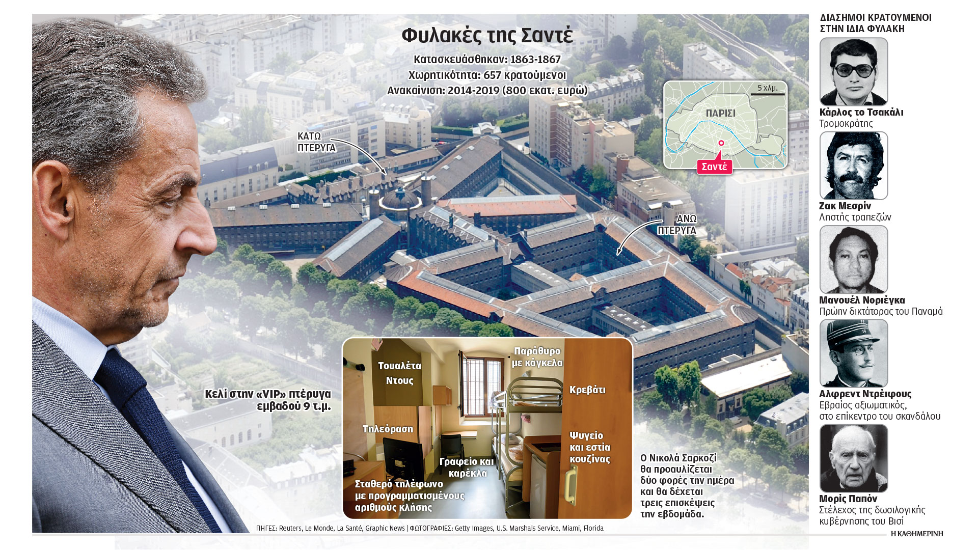 ΠΑΡΙΣΙ. Την πρώτη του νύχτα στις φυλακές της Σαντέ, στο 14ο δημοτικό διαμέρισμα της γαλλικής πρωτεύουσας, πέρασε χθες ο πρώην πρόεδρος της Γαλλίας, Νικολά Σαρκοζί, ένα μήνα μετά την καταδίκη του σε πενταετή κάθειρξη για σύσταση και συμμορία στην υπόθεση της χρηματοδότησης της προεκλογικής εκστρατείας του το 2007 από κεφάλαια του τότε Λίβυου ηγέτη Μουαμάρ Καντάφι. Είναι η πρώτη φορά που πρώην πρόεδρος της Γαλλικής Δημοκρατίας οδηγείται στις φυλακές κατά τη μεταπολεμική περίοδο.