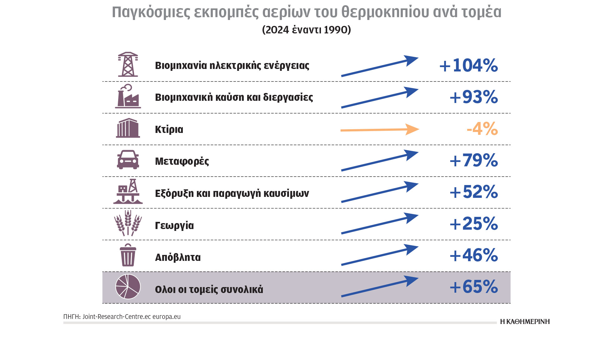 Οι παγκόσμιες εκπομπές αερίων του θερμοκηπίου του 2024 ήταν κατά 65% υψηλότερες έναντι του 1990 (ετήσια αύξηση 1,5%). Η Κίνα ήταν μακράν ο μεγαλύτερος ρυπαντής, ενώ οι ΗΠΑ ακολουθούσαν. Το 2024 ο τομέας της ηλεκτροπαραγωγής παρουσίασε τη μεγαλύτερη αύξηση (104%) λόγω της αυξανόμενης ζήτησης για ενέργεια, με τις βιομηχανικές διεργασίες (93%) και τις μεταφορές (79%) να έπονται. Αντιθέτως, τα κτίρια ήταν ο μόνος τομέας με μικρή μείωση (4%), λόγω βελτίωσης της ενεργειακής αποδοτικότητάς τους και χρήσης ανανεώσιμων. Δυστυχώς, η παγκόσμια προσπάθεια μείωσης των εκπομπών παραμένει ανεπαρκής για την αντιμετώπιση της κλιματικής κρίσης.