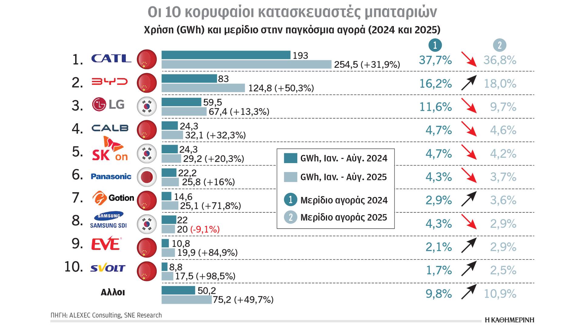 Εκεί στα μεγάλα, όπου Ε.Ε. και Δύση χάνουν τη μάχη. Από τους δέκα κορυφαίους κατασκευαστές μπαταριών, έξι είναι κινεζικοί, τρεις κορεατικοί και ένας ιαπωνικός. Ο ανταγωνισμός για την κυριαρχία στην αγορά παραμένει καθαρά ασιατικός, με τα πιο πρόσφατα δεδομένα να δείχνουν ότι η Κίνα επιταχύνει (κυρίως μέσω των κινεζικών startups), ενώ Κορέα και Ιαπωνία χάνουν συνεχώς αγοραστικό μερίδιο. Στόχος πλέον πολλών κινεζικών εταιρειών (όπως η BYD) είναι η ταυτόχρονη παραγωγή ηλεκτρικών αυτοκινήτων και μπαταριών. Η πρώτη σε κατάταξη κινεζική εταιρεία (CATL) παραμένει κυρίαρχη με μερίδιο αγοράς 36,8% το 2025, επιβεβαιώνοντας την παγκόσμια πρωτοκαθεδρία της, με τη δεύτερη σε κατάταξη να ακολουθεί στο 18%.