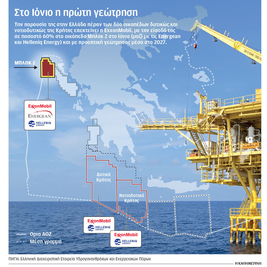 Το ενδιαφέρον της ExxonMobil για είσοδο στο Μπλοκ 2 στο Ιόνιο, βορειοδυτικά της Κέρκυρας, επισημοποιήθηκε χθες με την υπογραφή συμφωνίας με τις ελληνικές εταιρείες HELLENiQ ENERGY και Energean στο Ζάππειο, παρουσία του υπουργού Ενέργειας της Ελλάδας Σταύρου Παπασταύρου και των Αμερικανών υπουργών Ενέργειας Κρις Ράιτ και Εσωτερικών Νταγκ Μπέργκαμ, στην έναρξη των εργασιών της Διατλαντικής Ενεργειακής Συνεργασίας (P-ΤEC).
