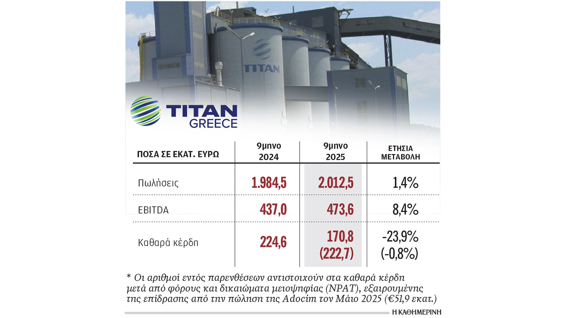 Εν τω μεταξύ, συνεχίζεται το επενδυτικό πρόγραμμα του ομίλου, καθώς, όπως έγινε γνωστό χθες, ο όμιλος βρίσκεται σε αποκλειστικές διαπραγματεύσεις για την εξαγορά της εταιρείας Les Vracs de l’ Estuaire, η οποία διαθέτει υπερσύγχρονες εγκαταστάσεις, συμπεριλαμβανομένου εργοστασίου άλεσης στο λιμάνι της Χάβρης, στη βόρεια Γαλλία. Η στρατηγική αυτή επένδυση ενισχύει την παρουσία του ομίλου ΤΙΤΑΝ στη Γαλλία, αξιοποιώντας και επεκτείνοντας τις υφιστάμενες δραστηριότητές του στην αγορά της Μασσαλίας. Η ολοκλήρωσή της παραμένει υπό την αίρεση των συνήθων νομικών διαδικασιών και αναμένεται το πρώτο τρίμηνο του 2026. Το φετινό εννεάμηνο οι επενδύσεις του ομίλου ανήλθαν σε 185 εκατ. ευρώ, από 181 εκατ. ευρώ πέρυσι.