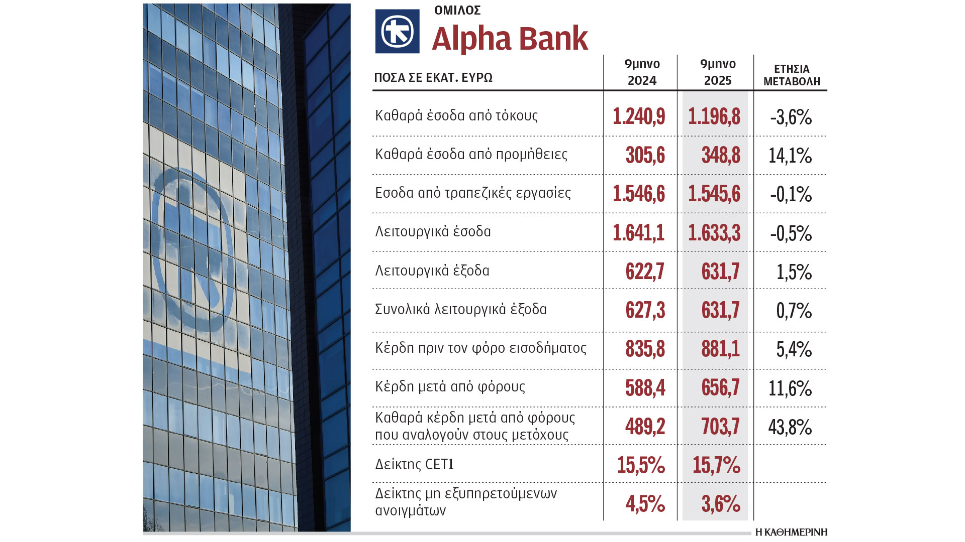 Καθαρά κέρδη 703,7 εκατ. ευρώ, αυξημένα κατά 43,8% σε σχέση με το αντίστοιχο περυσινό διάστημα, κατέγραψε το εννεάμηνο η Alpha Bank, επίπεδο που σύμφωνα με τη διοίκηση αποτελεί ιστορικό ρεκόρ, καθώς υπερβαίνει τα ετήσια κέρδη προηγούμενων ετών.