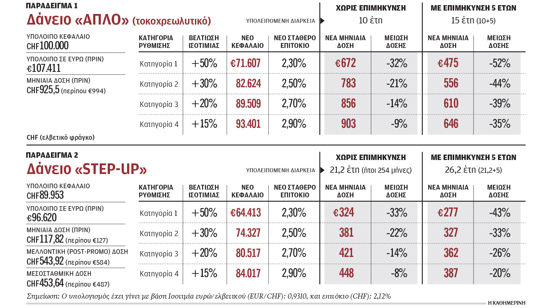 Εστω, π.χ., ότι κάποιος έχει σήμερα οφειλή 100.000 ελβετικών φράγκων. Σε ευρώ η οφειλή μεταφράζεται σε 107.411 (ο υπολογισμός έχει γίνει με βάση ισοτιμία ευρώ/ελβετικού: 0,9310 και επιτόκιο ελβετικού: 2,12%). Εφόσον πληροί τα εισοδηματικά και περιουσιακά κριτήρια της κατηγορίας 1 μπορεί να πάρει μείωση ισοτιμίας 50% και το κεφάλαιό του να μειωθεί σε 71.607 ευρώ. Με σταθερό επιτόκιο 2,30% η μηνιαία δόση διαμορφώνεται σε 672 ευρώ και υπολογίζεται ότι μειώνεται κατά 32% σε σχέση με ό,τι πλήρωνε έως σήμερα.