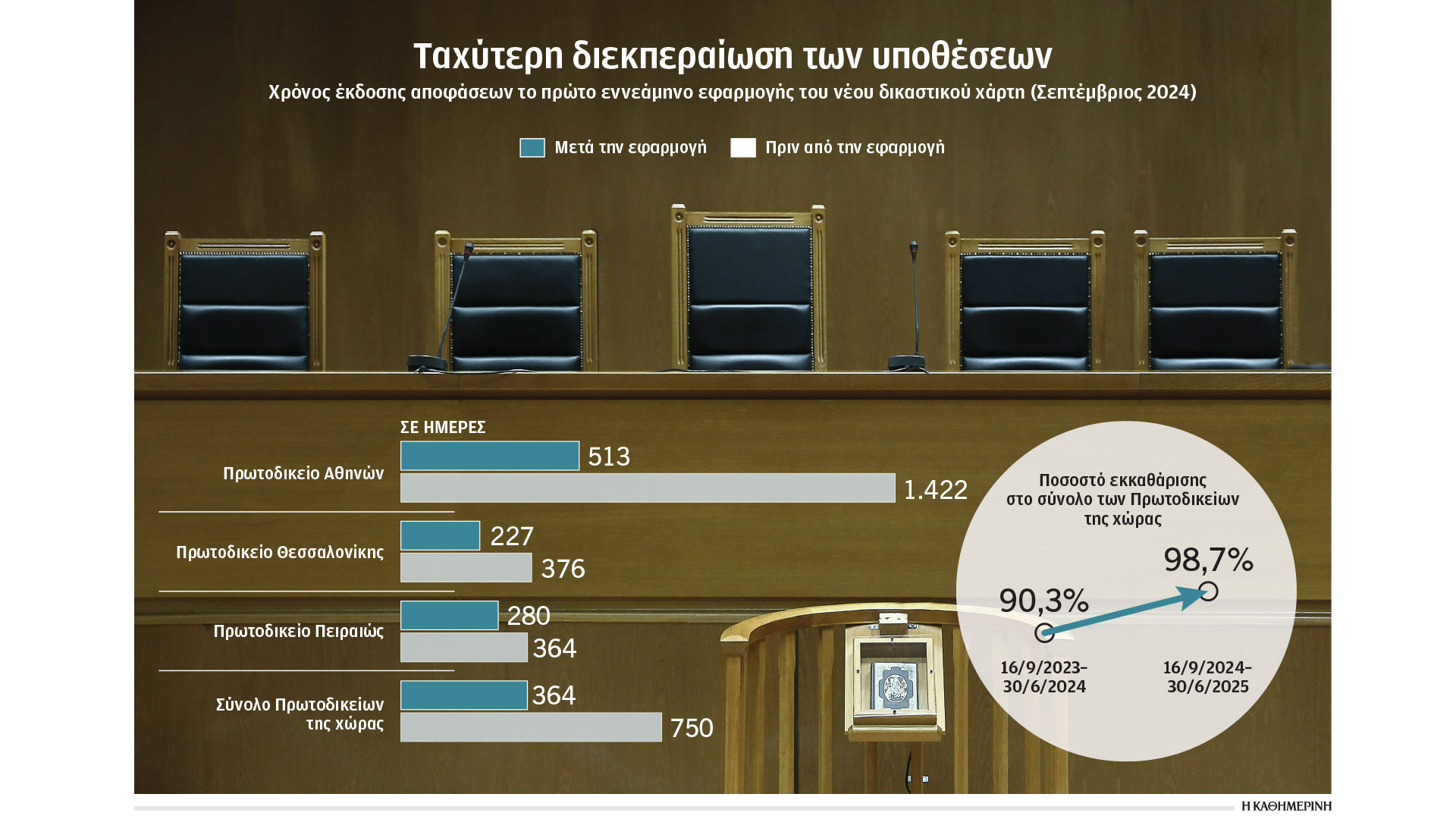 Η μείωση κατά 53,2% του χρόνου έκδοσης πρωτόδικων αποφάσεων αλλά και η αύξηση κατά 83% του ρυθμού εκκαθάρισης των υποθέσεων είναι κάποια από τα πρώτα θετικά αποτελέσματα που σημειώνει η εφαρμογή του νέου δικαστικού χάρτη. Ο χρόνος έκδοσης των δικαστικών αποφάσεων στα Πρωτοδικεία της χώρας μειώθηκε από τις 750 ημέρες στις 364, ενώ στο Πρωτοδικείο Αθηνών, που αποτελεί κι ένα από τα μεγαλύτερα της Ευρώπης, ο χρόνος έκδοσης των αποφάσεων μειώθηκε από τις 1.422 ημέρες στις 513, δηλαδή η έκδοση των αποφάσεων μειώθηκε από τέσσερα χρόνια σε ενάμισι έτος, σύμφωνα με τα στοιχεία του γραφείου συλλογής στατιστικών στοιχείων (JustStat) του υπουργείου Δικαιοσύνης.