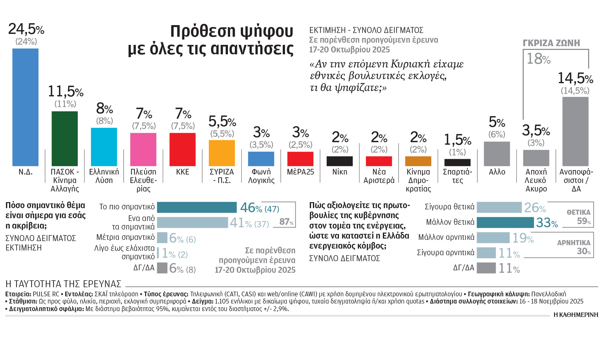 Οι σημαντικές πρωτοβουλίες στον τομέα της ενέργειας και το καλό επίπεδο συνεργασίας με τον αμερικανικό παράγοντα φαίνεται πως βοήθησαν την κυβέρνηση να ξεκολλήσει λίγο τη «βελόνα» στη δημοσκόπηση της Pulse που πραγματοποιήθηκε για λογαριασμό του ΣΚΑΪ. Στην πρόθεση ψήφου η Νέα Δημοκρατία κερδίζει μισή μονάδα σε σχέση με ένα μήνα πριν και φθάνει στο 24,5%, διατηρώντας απόσταση ασφαλείας από το δεύτερο ΠΑΣΟΚ. Το κόμμα του Νίκου Ανδρουλάκη αποτυπώνεται στο 11,5% και ανεβαίνει επίσης κατά 0,5%. Η διαφορά μεταξύ τους παραμένει διψήφια, στο 13%.