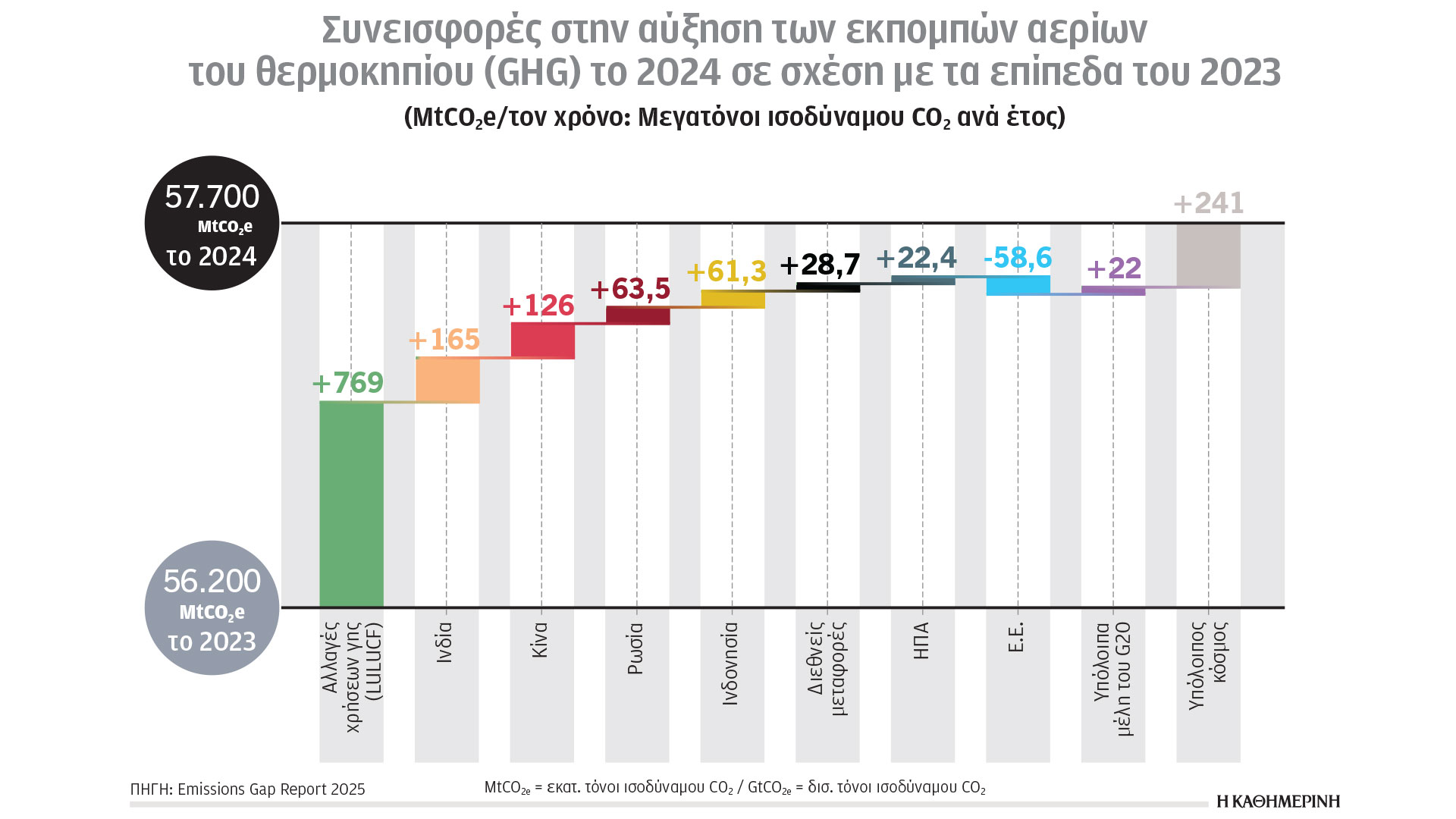 Το 2024 οι παγκόσμιες εκπομπές αερίων του θερμοκηπίου σημείωσαν αύξηση ύψους 2,7% (από 56,2 GtCO2e το 2023 έφτασαν στα 57,7 GtCO2e το 2024). Η Κίνα, οι Ηνωμένες Πολιτείες Αμερικής, η Ρωσία, η Ινδία και η Ινδονησία σημείωσαν άνοδο στις εκπομπές θερμοκηπίου, ενώ η Ευρωπαϊκή Ενωση ήταν η μοναδική που κατέγραψε μείωση, της τάξης του 2,1%. Σε απόλυτους αριθμούς, η Ινδία, η Κίνα και ο τομέας αλλαγής χρήσεων γης παρουσίασαν τις μεγαλύτερες αυξήσεις εκπομπών αερίων του θερμοκηπίου (165, 126 και 769 GtCO2e, αντιστοίχως).