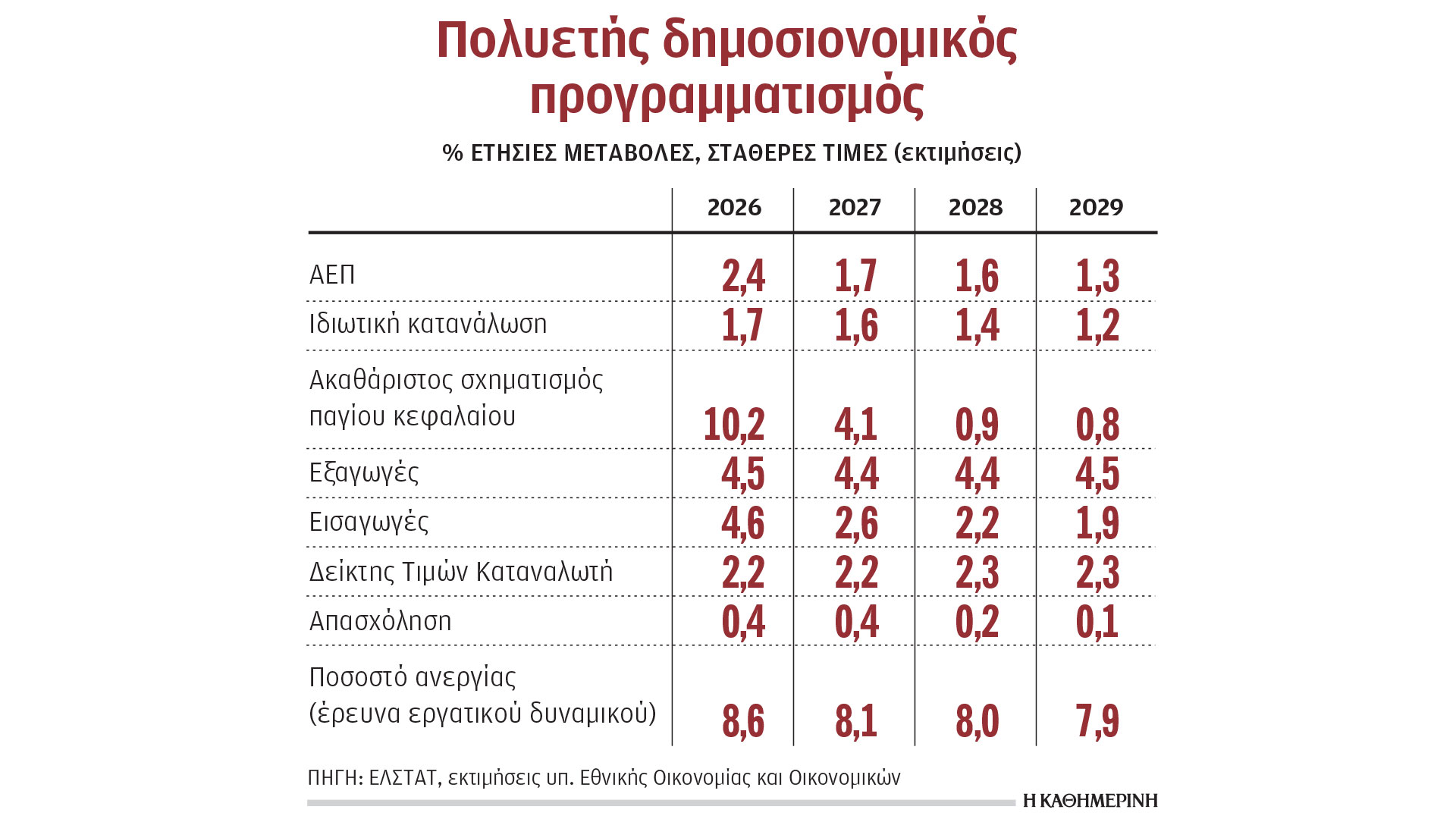 Σύμφωνα με αυτές, ο ρυθμός ανάπτυξης θα υποχωρήσει από το προβλεπόμενο 2,4% του 2026 στο 1,7% το 2027, 1,6% το 2028 και 1,3% το 2029. Αυτό σημαίνει ότι η σύγκλιση πιθανώς θα επιβραδυνθεί εφόσον η Ε.Ε. μείνει στην περιοχή του 1,2-1,3%, όπου προβλέπεται να κινείται φέτος και του χρόνου. Η επιβράδυνση είναι προφανώς αποτέλεσμα της μείωσης των επενδύσεων, σε μεγάλο βαθμό. Η κυβέρνηση προβλέπει αύξησή τους κατά 10,2% φέτος και στη συνέχεια υποχώρηση του ρυθμού στο 4,1% το 2027, 0,9% το 2028 και 0,8% το 2029. Κι αυτό είναι φυσικό, αφού τα 7,192 δισ. ευρώ των επενδυτικών δαπανών του Ταμείου Ανάκαμψης το 2026 δεν θα υπάρχουν τα επόμενα χρόνια. Η προβλεπόμενη αύξηση του ΠΔΕ, εθνικού και συγχρηματοδοτούμενου (από 9,5 δισ. ευρώ το 2026 στα 11,75 δισ. το 2029), δεν είναι αρκετή για να καλύψει το κενό αυτό.