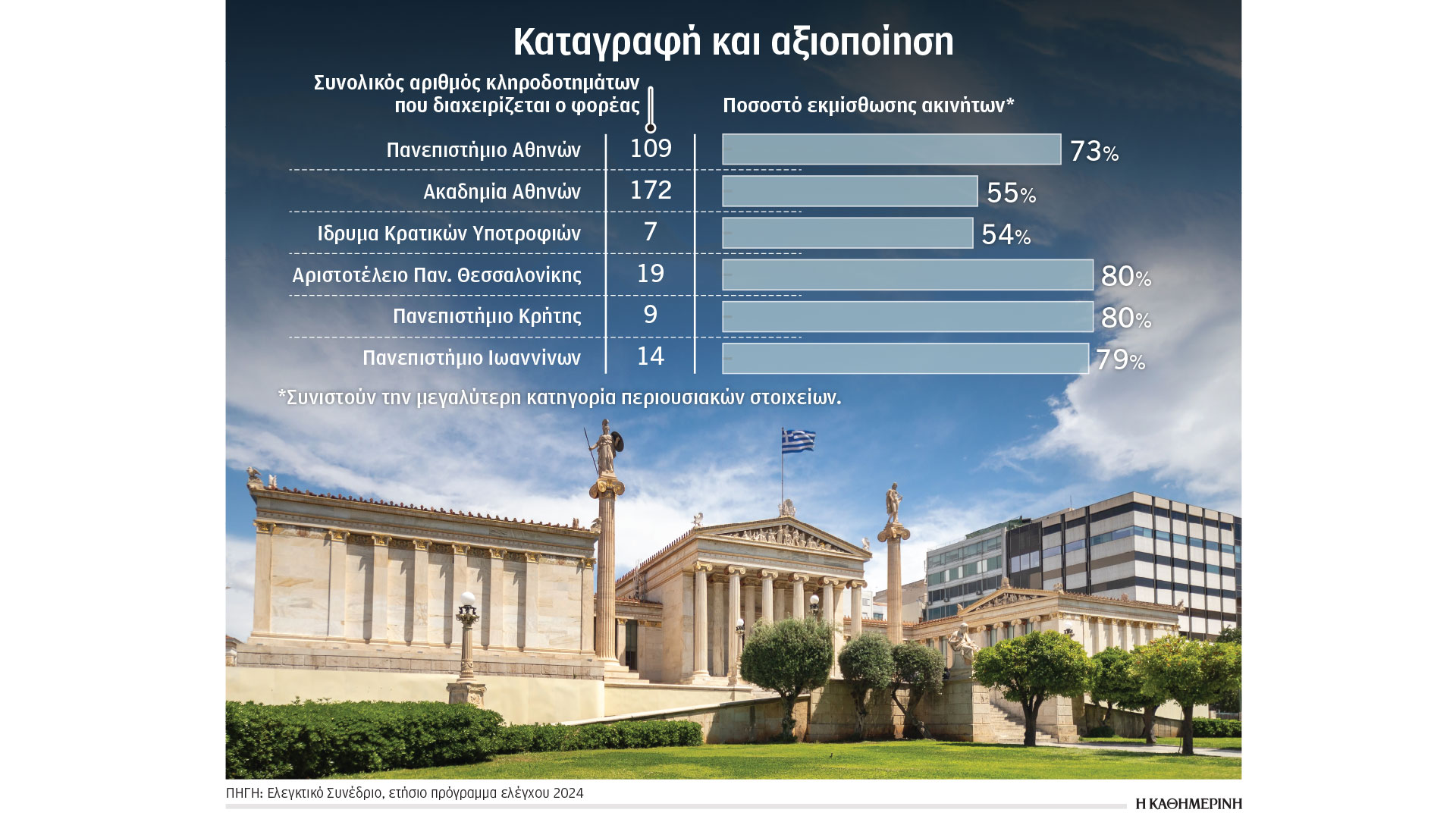 Την εντυπωσιακή απουσία ελέγχου και εποπτείας στη διαχείριση των κληροδοτημάτων που έχουν αφεθεί από πολίτες στα ΑΕΙ, στην Ακαδημία Αθηνών αλλά και στο Ιδρυμα Κρατικών Υποτροφιών διαπιστώνει σε έκθεση που συνέταξε το Ελεγκτικό Συνέδριο. Κατά την έκθεση, που αριθμεί 36 σελίδες, «η πλειονότητα των κληροδοτημάτων επί σειρά πολλών ετών δεν έχουν υποβληθεί σε κανέναν απολύτως έλεγχο», με αποτέλεσμα να είναι «θολή» η πραγματική εικόνα της διαχείρισης και της αξιοποίησής τους. Ο έλεγχος που πραγματοποιήθηκε το 2024 για τα κληροδοτήματα (αφορά κυρίως τα έτη 2022-2023) έδειξε πως, παρότι αξιοποιείται σημαντικό μέρος των περιουσιών, υπάρχουν σοβαρές ελλείψεις στην καταγραφή και παρακολούθησή τους. Εντυπωσιακό είναι το γεγονός ότι μία δεκαετία μετά, η σχετική νομοθετική μεταρρύθμιση του ν. 4182/2013 δεν είχε ολοκληρωθεί, καθώς έλειπαν κρίσιμες κανονιστικές αποφάσεις που θα αποσαφήνιζαν σημαντικά ζητήματα τα οποία απασχολούν τους φορείς διαχείρισης των κληροδοτημάτων και θα ενεργοποιούσαν ορισμένες καίριας σημασίας ρυθμίσεις του νέου θεσμικού πλαισίου.