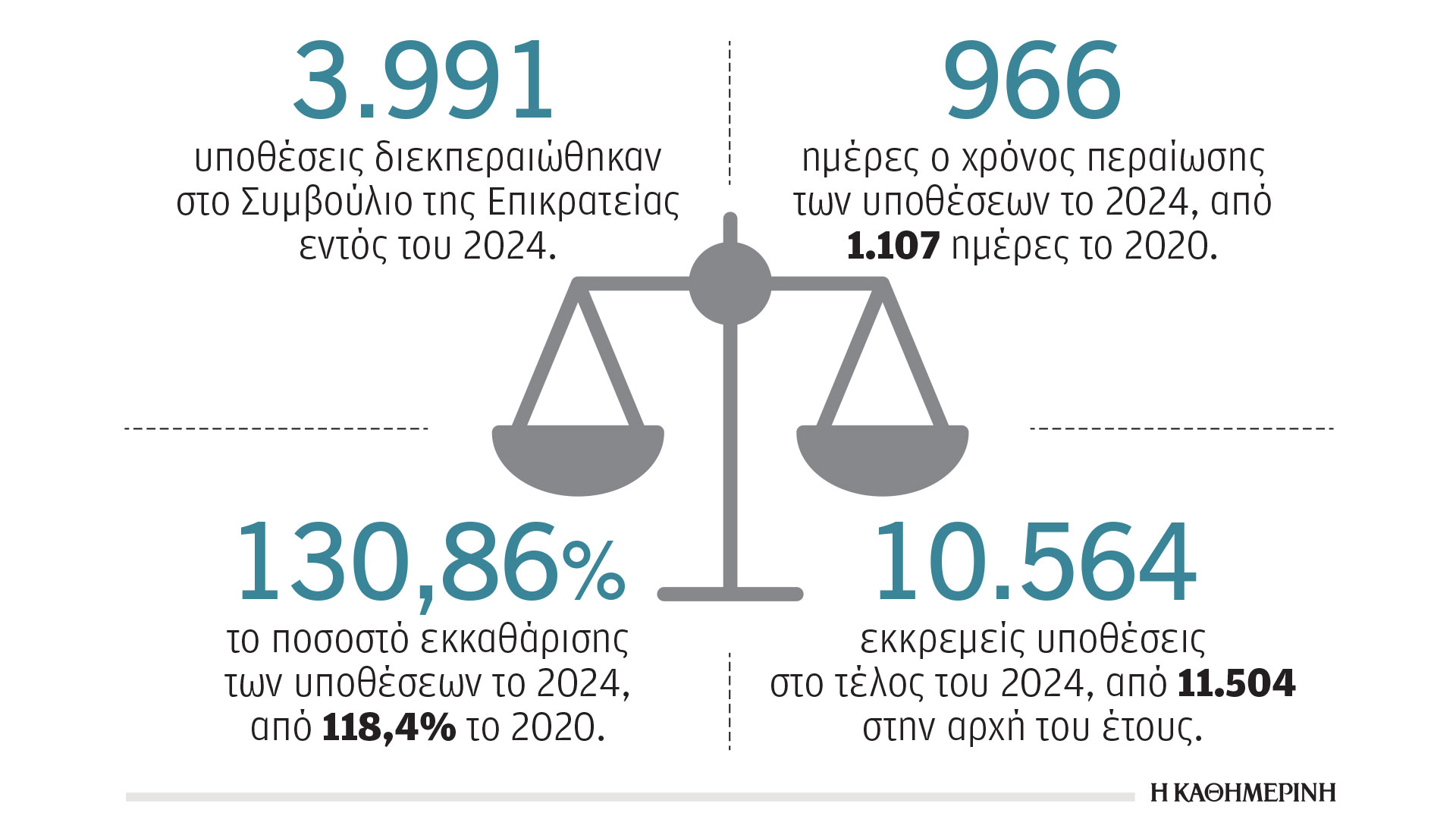 Βελτίωση ως προς το ύψος των εκκρεμών υποθέσεων σημείωσε κατά το 2024 το Συμβούλιο της Επικρατείας, σύμφωνα με την ετήσια έκθεση που παρουσίασε ο πρόεδρος του ανωτάτου δικαστηρίου Μιχάλης Πικραμένος. Σύμφωνα με τα στατιστικά στοιχεία της έκθεσης, το περασμένο έτος οι εκκρεμείς υποθέσεις την 1/1/2024 ήταν 11.504, το ίδιο έτος εισήχθησαν συνολικά 3.050 υποθέσεις, διεκπεραιώθηκαν 3.991 και στις 31/12/2024 οι εκκρεμείς υποθέσεις ήταν 10.564.