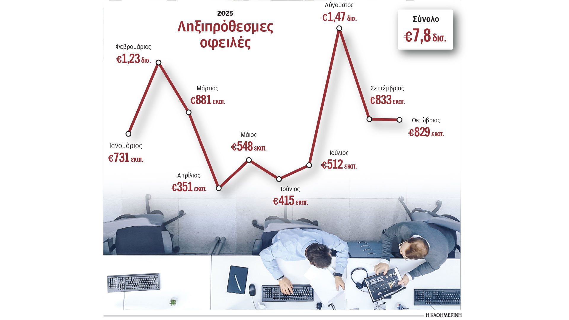 Η εκτίναξη των ληξιπρόθεσμων οφειλών στο διάστημα Ιανουαρίου – Οκτωβρίου προβληματίζει το οικονομικό επιτελείο της κυβέρνησης, καθώς ένα σημαντικό τμήμα των νέων χρεών που έχουν δημιουργηθεί προέρχεται από φυσικά πρόσωπα τα οποία αδυνατούν να ανταποκριθούν στις φορολογικές υποχρεώσεις τους. Συνολικά στο 10μηνο του έτους τα χρέη των φορολογουμένων προς την εφορία έχουν φθάσει στα 7,8 δισ. ευρώ, εκ των οποίων τα 7,2 δισ. ευρώ αφορούν τους φόρους.