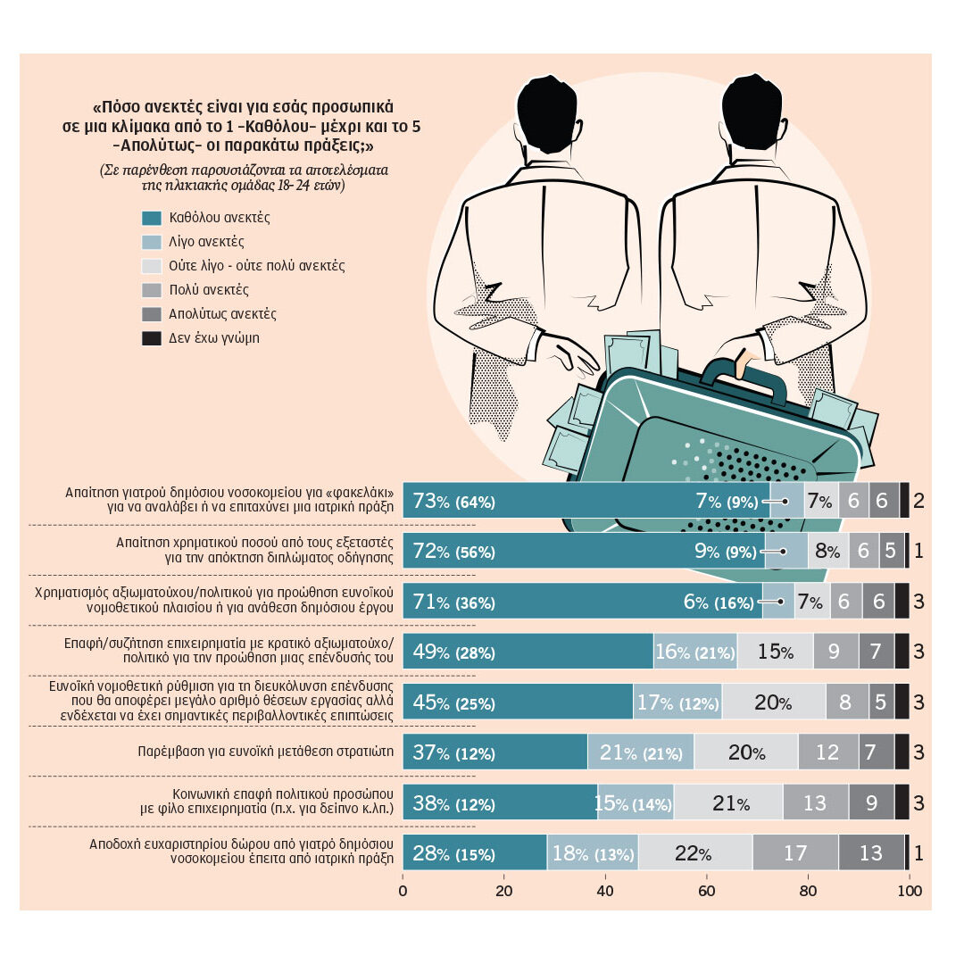 Λιγότερο ανεκτές είναι η απαίτηση γιατρού δημόσιου νοσοκομείου για «φακελάκι», η απαίτηση χρηματικού ποσού από τους εξεταστές για απόκτηση διπλώματος οδήγησης και ο χρηματισμός αξιωματούχου/πολιτικού για προώθηση ευνοϊκού νομοθετικού πλαισίου ή για ανάθεση δημοσίου έργου (77%-80% καθόλου» ή λίγο ανεκτά σε αυτές τις τρεις περιπτώσεις). Μεγαλύτερο βαθμό ανοχής καταγράφουν ενέργειες όπως η επαφή επιχειρηματία με κρατικό αξιωματούχο για προώθηση επένδυσης (65% καθόλου ή λίγο ανεκτή), η ευνοϊκή νομοθετική ρύθμιση για τη διευκόλυνση επένδυσης που θα αποφέρει μεγάλο αριθμό θέσεων εργασίας, αλλά ενδέχεται να έχει σημαντικές περιβαλλοντικές επιπτώσεις (62% καθόλου ή λίγο ανεκτή), και η παρέμβαση για ευνοϊκή μετάθεση στρατιώτη (58% καθόλου ή λίγο ανεκτή).